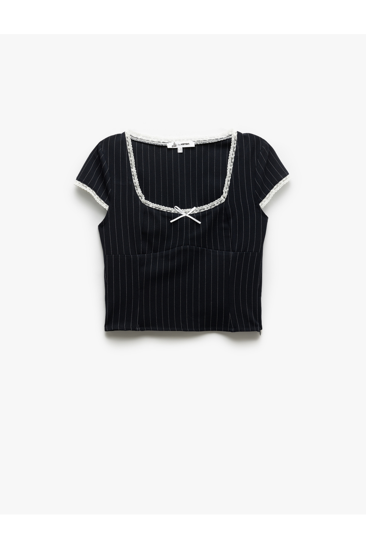 Dantel Detaylı Çizgili Kısa Kollu Slim Fit Bluz Dantel Detaylı Çizgili Kısa Kollu Slim Fit Bluz 5SAL60085IW7S0-1013002 42