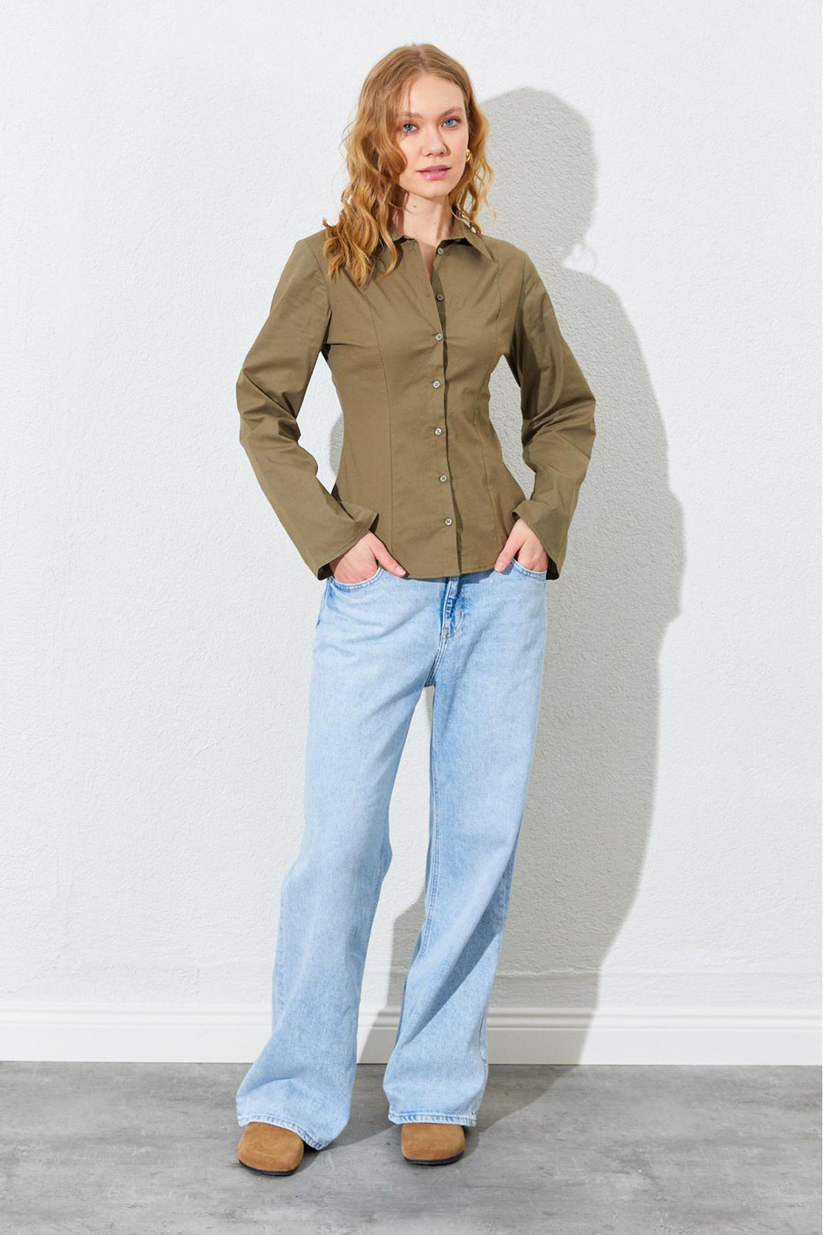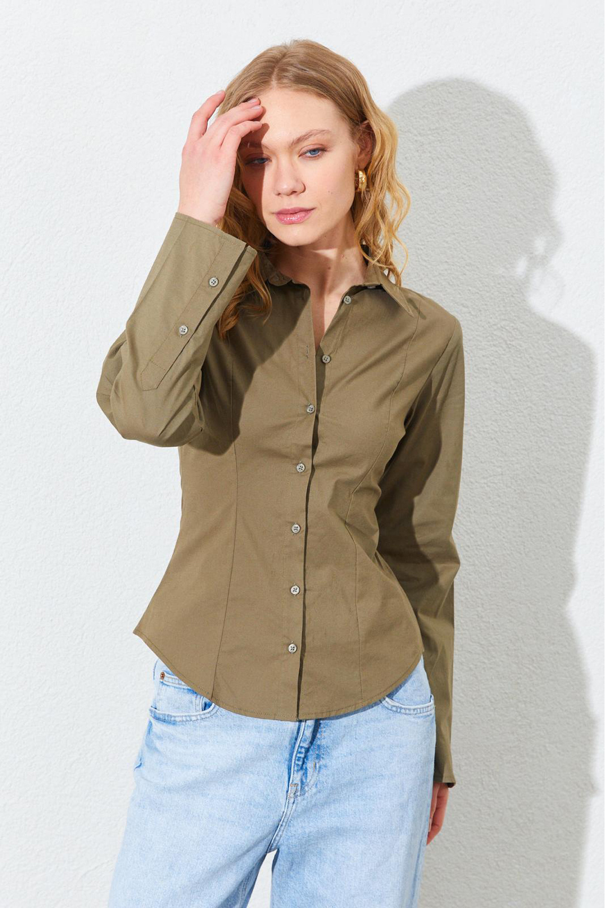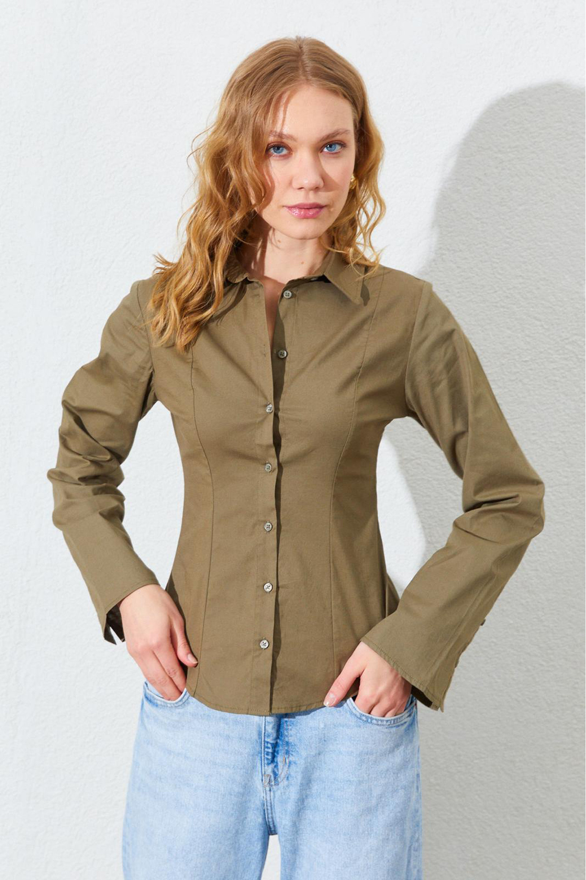 Bel Oturtmalı İspanyol Kol Lİkralı Pamuk Gömlek - Haki | MKS161463-01 Bel Oturtmalı İspanyol Kol Lİkralı Pamuk Gömlek - Haki | MKS161463-01 XL