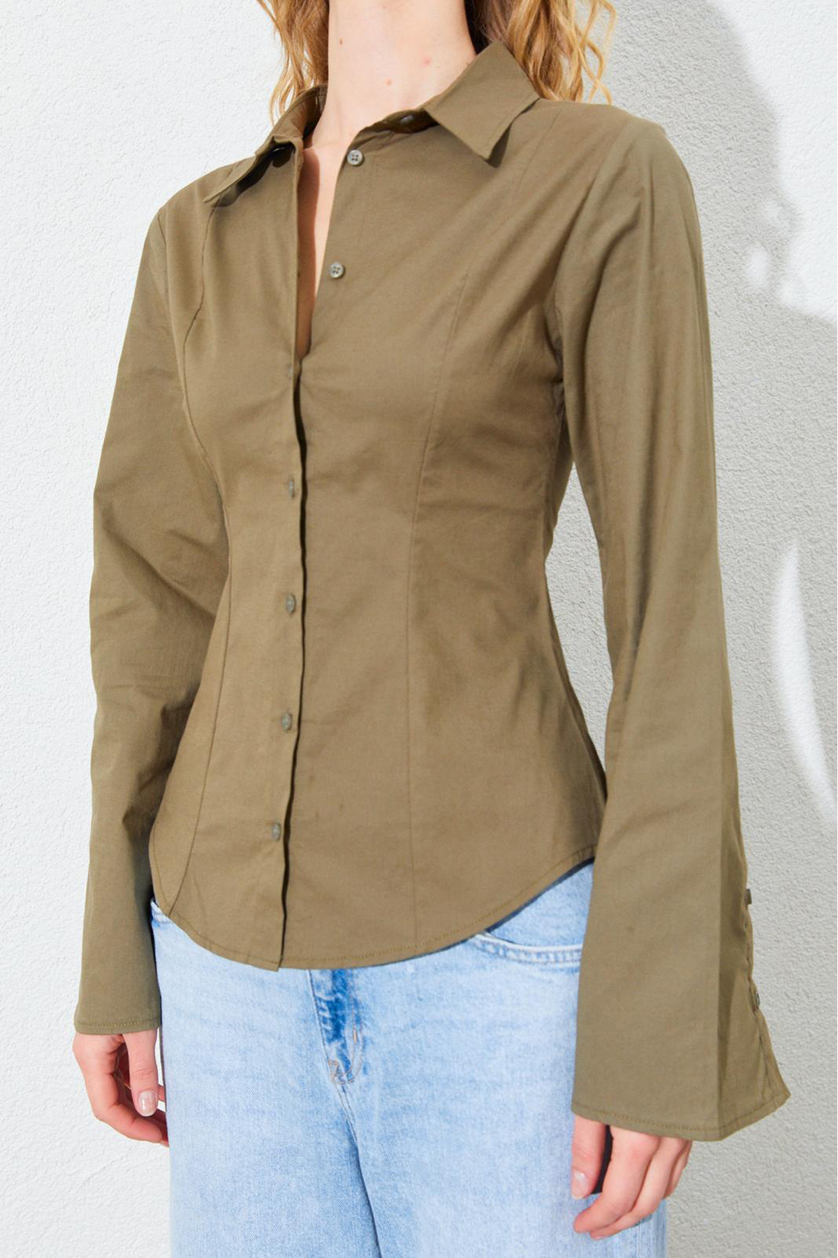 Haki Bel Oturtmalı İspanyol Kol 100% Pamuk Gömlek | EDİ100166847 Haki Bel Oturtmalı İspanyol Kol 100% Pamuk Gömlek | EDİ100166847 L