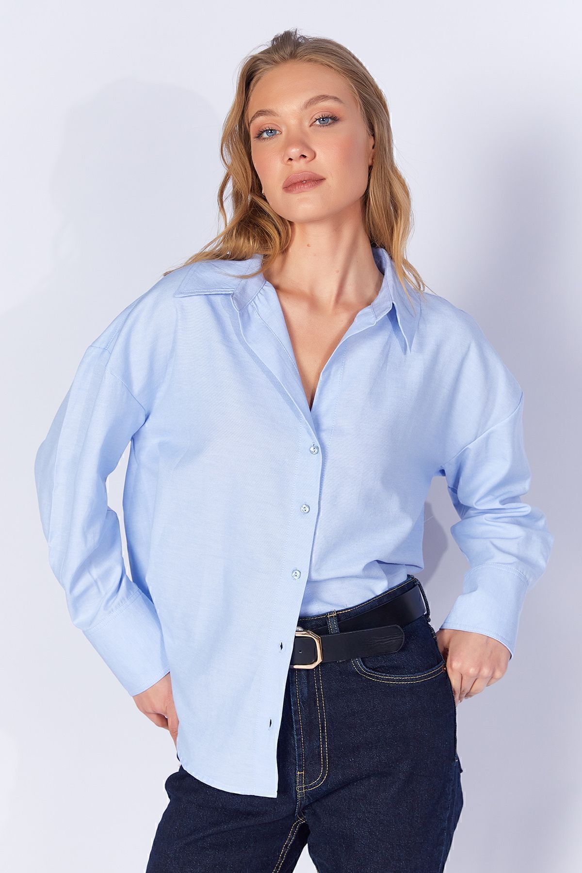 Bebe Mavi Kolları Salaş Yıkamalı Müslin Oversize Rahat Kalıp Kadın Basic Gömlek | MKS166881-01 Bebe Mavi Kolları Salaş Yıkamalı Müslin Oversize Rahat Kalıp Kadın Basic Gömlek | MKS166881-01 L