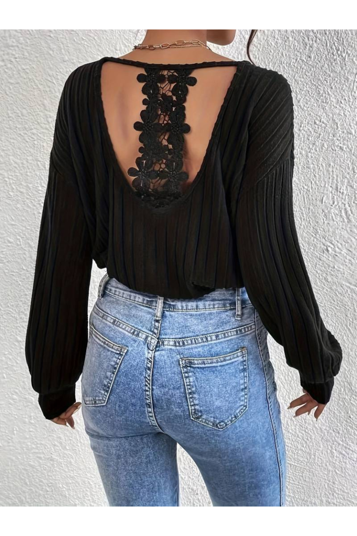 Kadın Uzun Kollu V Yakalı Pencere Sırt Dantel Detaylı Kalın Fitilli Kaşkorse Bluz Kadın Uzun Kollu V Yakalı Pencere Sırt Dantel Detaylı Kalın Fitilli Kaşkorse Bluz ALB-HHIDVZE4WPIR0 2XL-3XL
