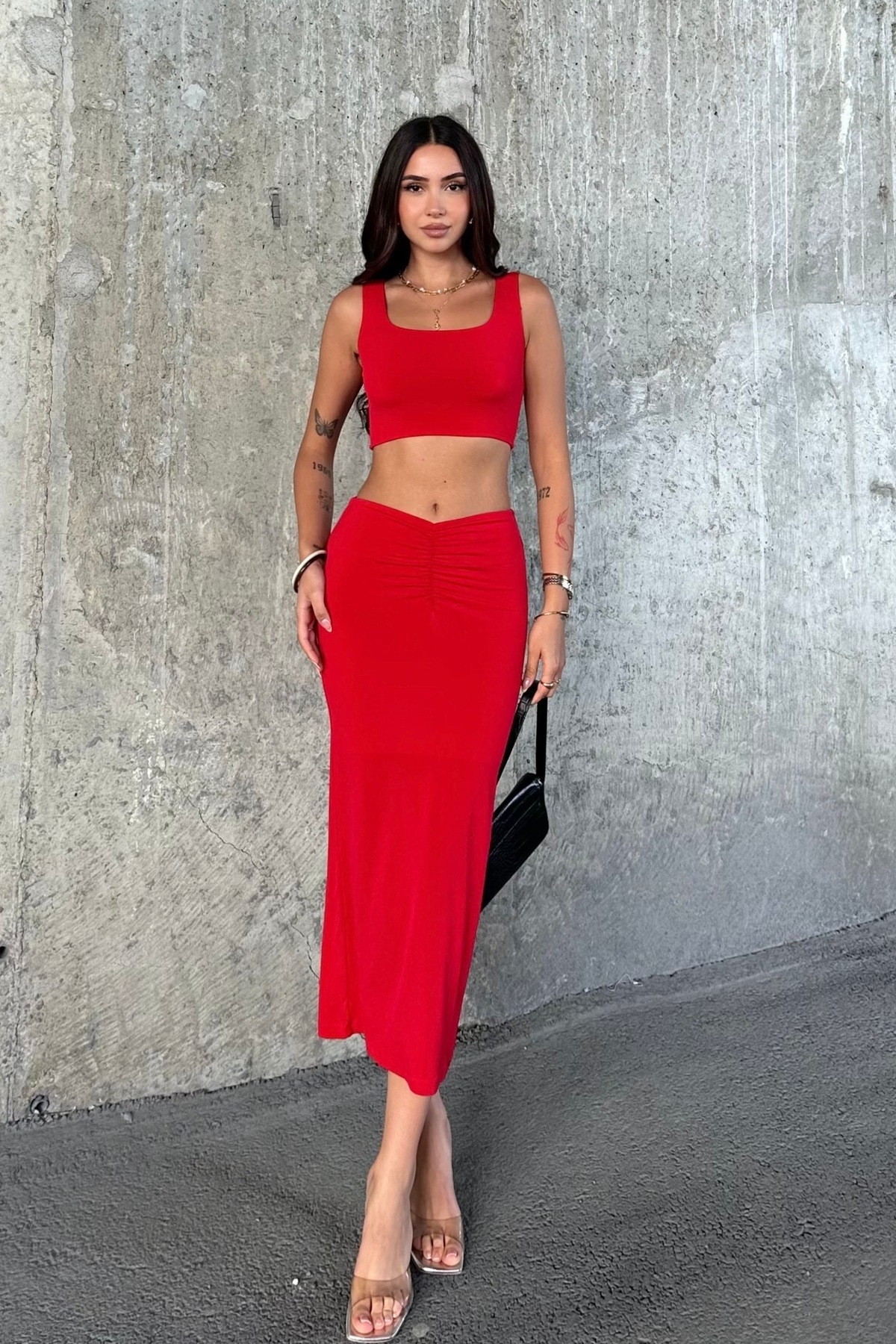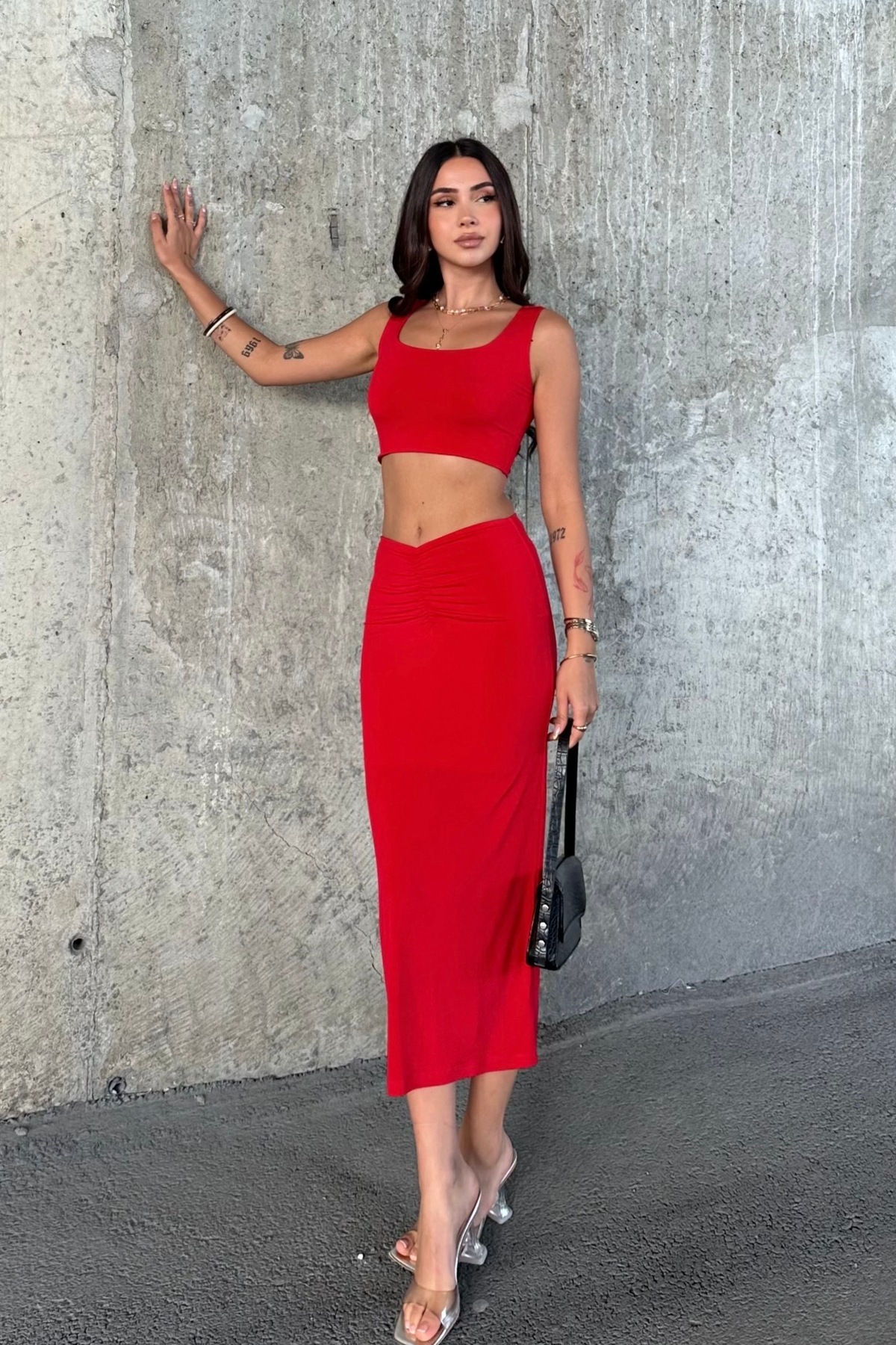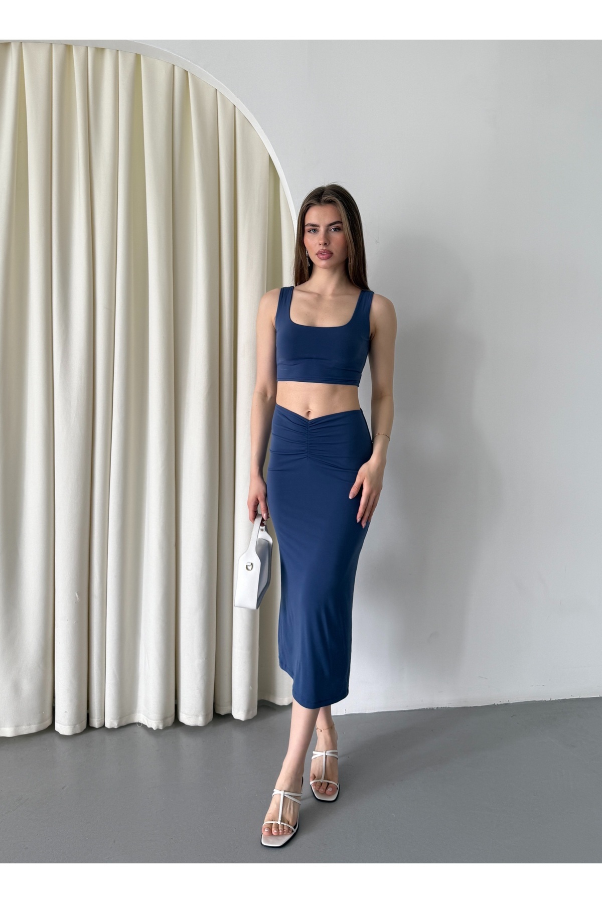 ETEK TAKIM-ÖN BÜZGÜ DETAYLI,ASTARLI,MİDİ BOY ETEK.KALIN ASKILI,CROP BLUZ. ETEK TAKIM-ÖN BÜZGÜ DETAYLI,ASTARLI,MİDİ BOY ETEK.KALIN ASKILI,CROP BLUZ. 621 XL