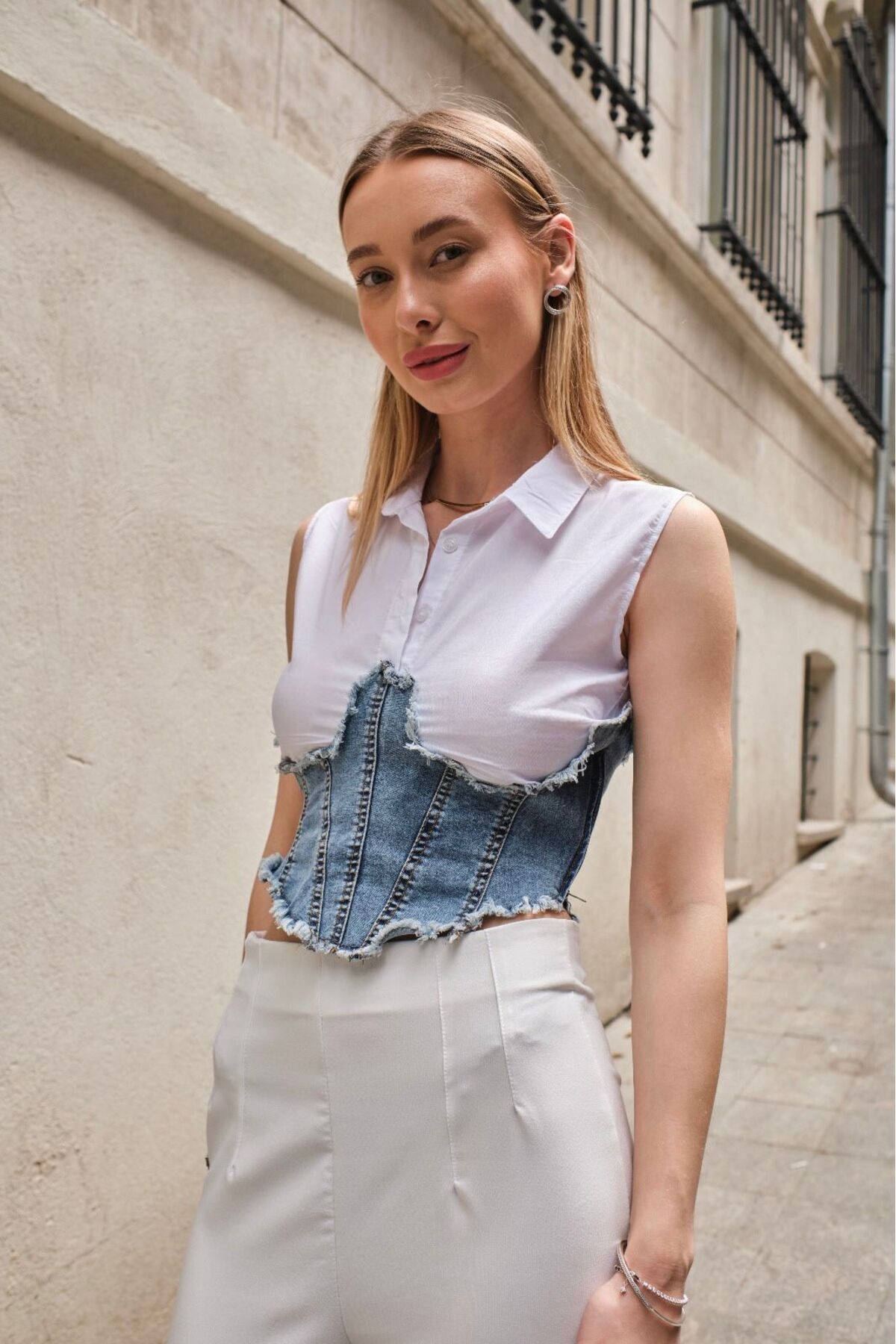 Corset Denim Blanc Kot Korse Detaylı Rahat Gömlek Crop Corset Denim Blanc Kot Korse Detaylı Rahat Gömlek Crop EL021 XL