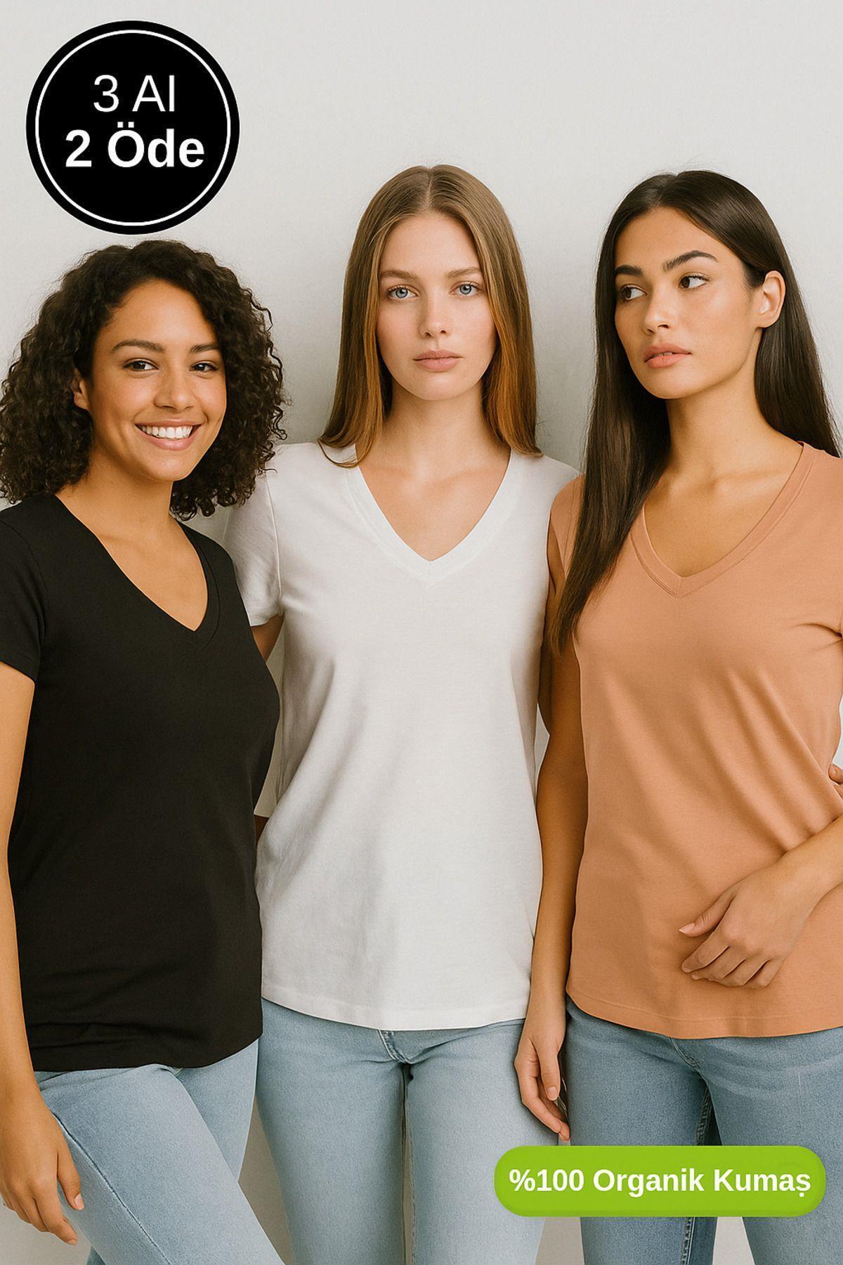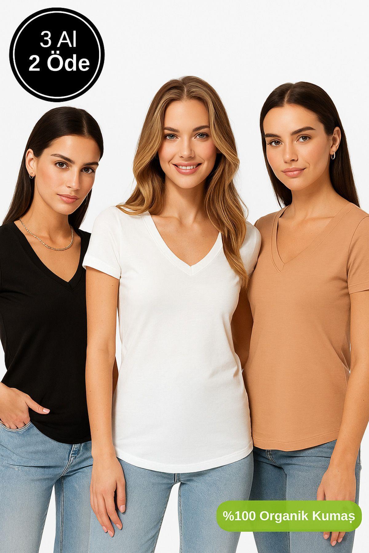 Kadın 3'lü Paket Siyah-Beyaz-Kahverengi %100 Organik Pamuk Normal Kesim Tişört V Yaka T-Shirt Kadın 3'lü Paket Siyah-Beyaz-Kahverengi %100 Organik Pamuk Normal Kesim Tişört V Yaka T-Shirt organikv2li XL