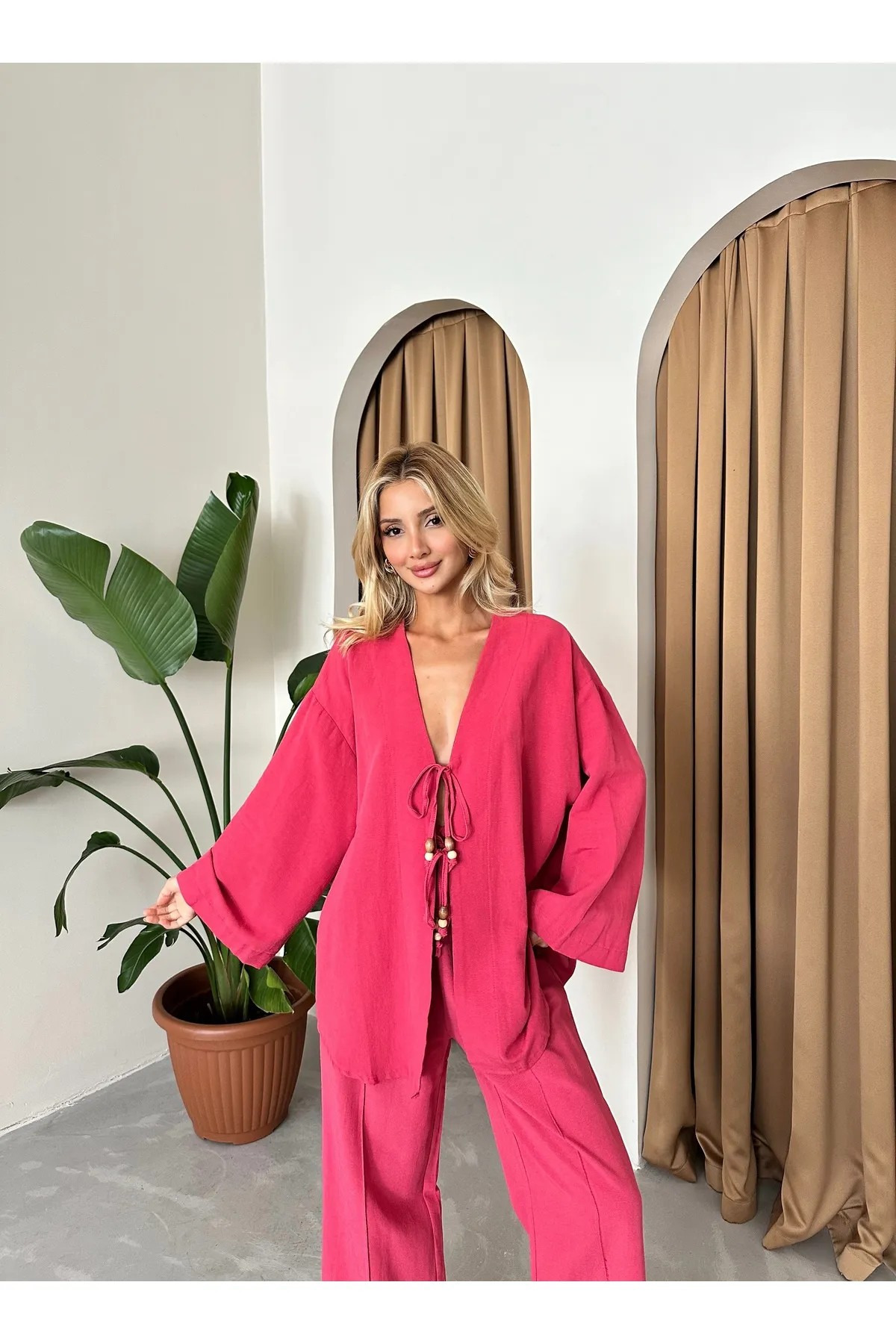 Vişne Boncuklu Kimono Keten Takım - 8321 Vişne Boncuklu Kimono Keten Takım - 8321 Efil - 8321 L