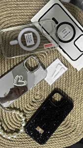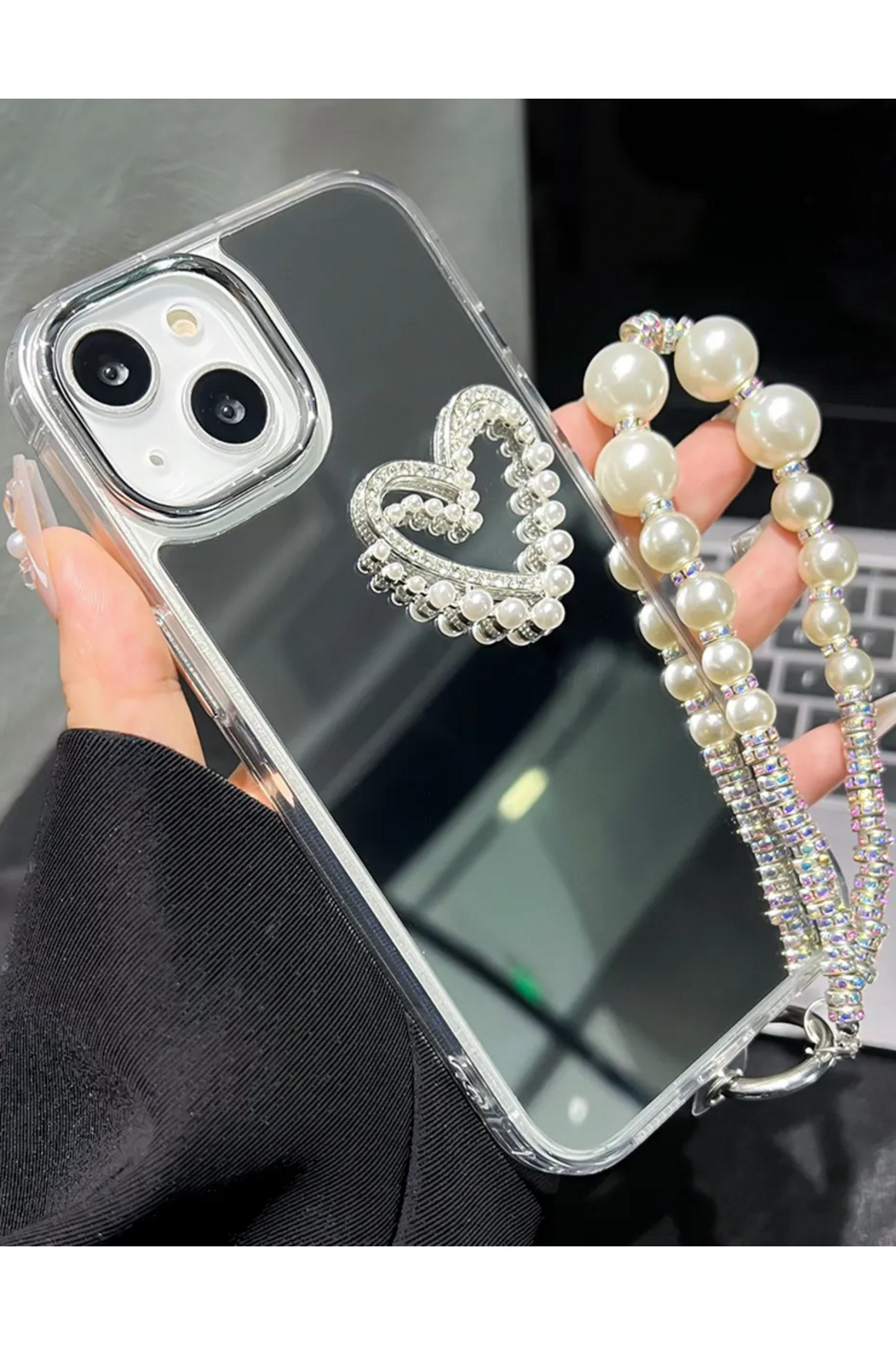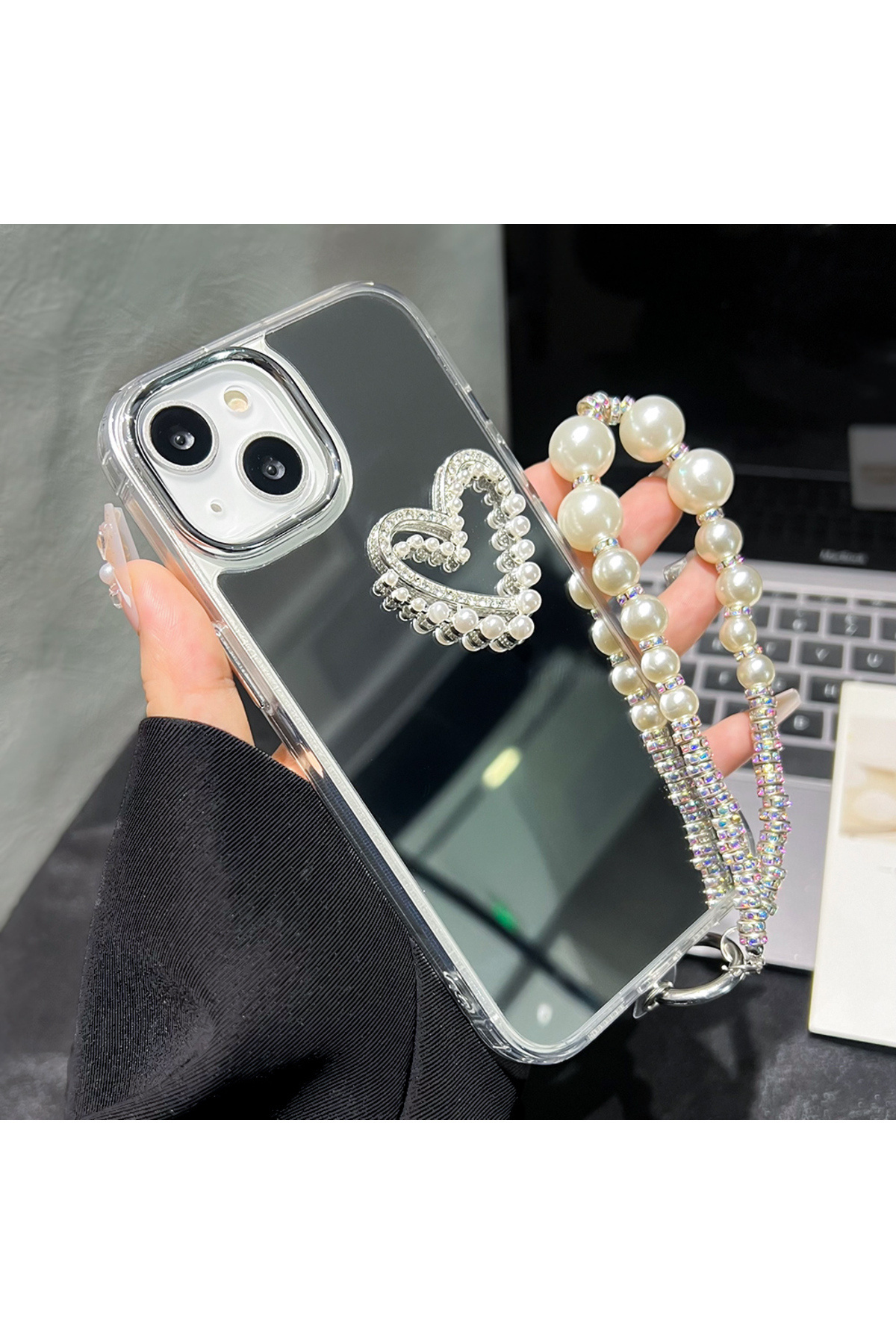 Apple iPhone 13 - 14 - 15 Kılıf Aynalı İnci Charm Askılı Kalp Tasarımlı Desenli Silikon Kapak Apple iPhone 13 - 14 - 15 Kılıf Aynalı İnci Charm Askılı Kalp Tasarımlı Desenli Silikon Kapak FIGURLU IPHONE 13/14 تک سایز