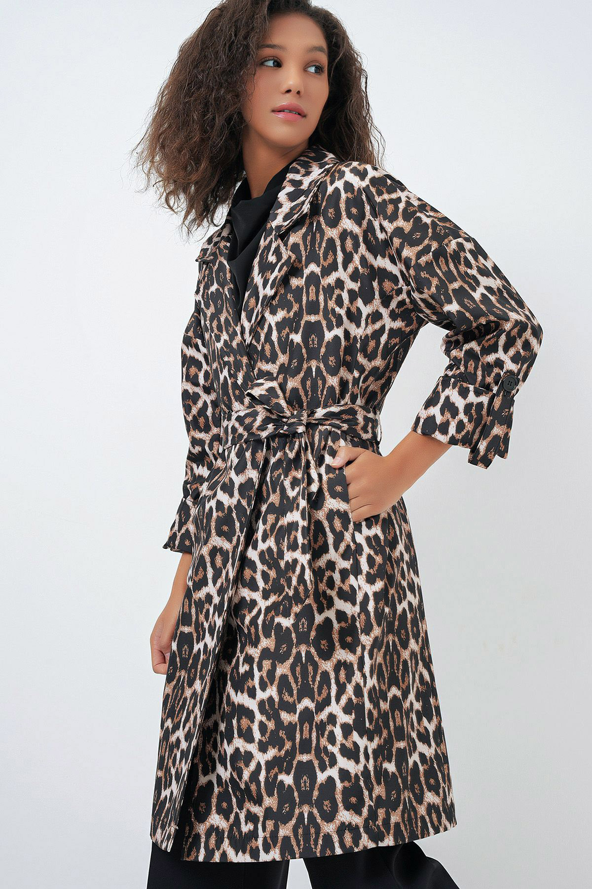 Kadın Yandan Cepli Beli Kemerli Astarlı Leopar Desenli Trençkot Kadın Yandan Cepli Beli Kemerli Astarlı Leopar Desenli Trençkot LPS-24Y0840131 XL