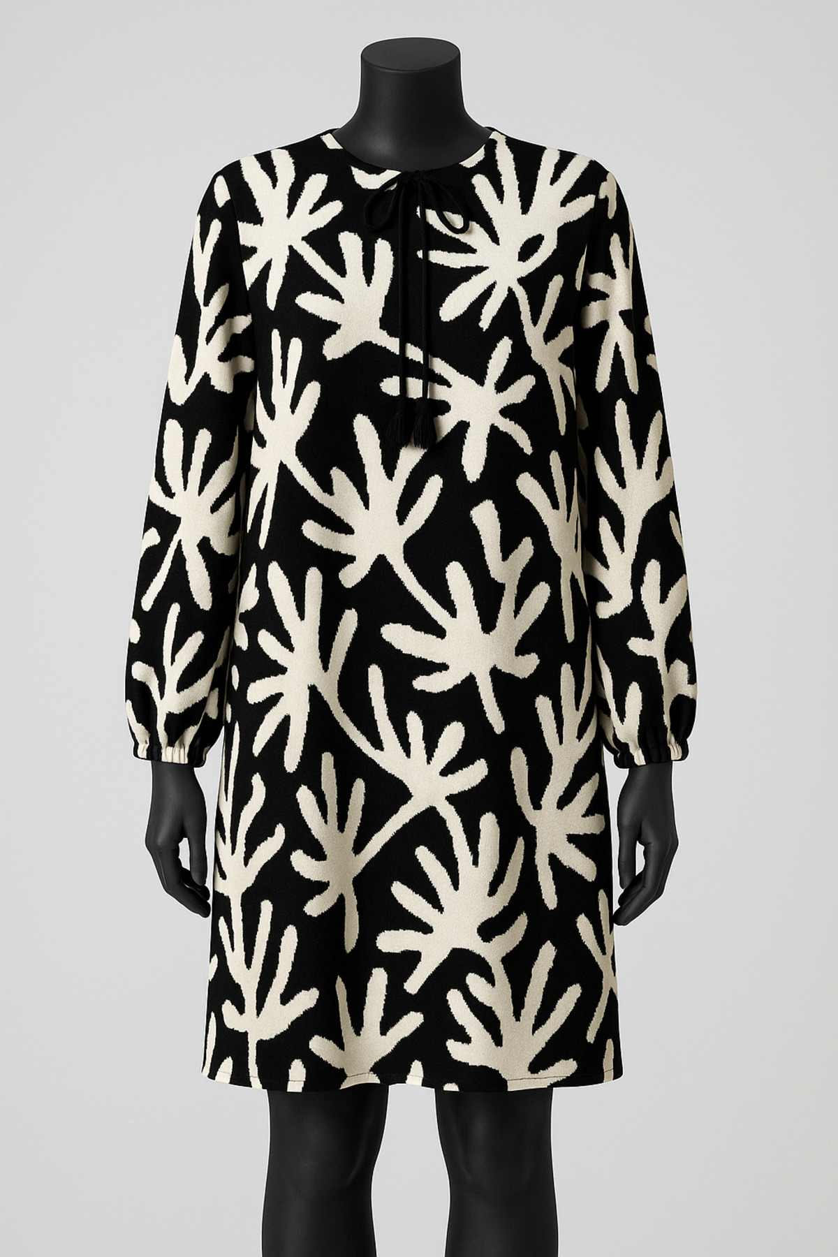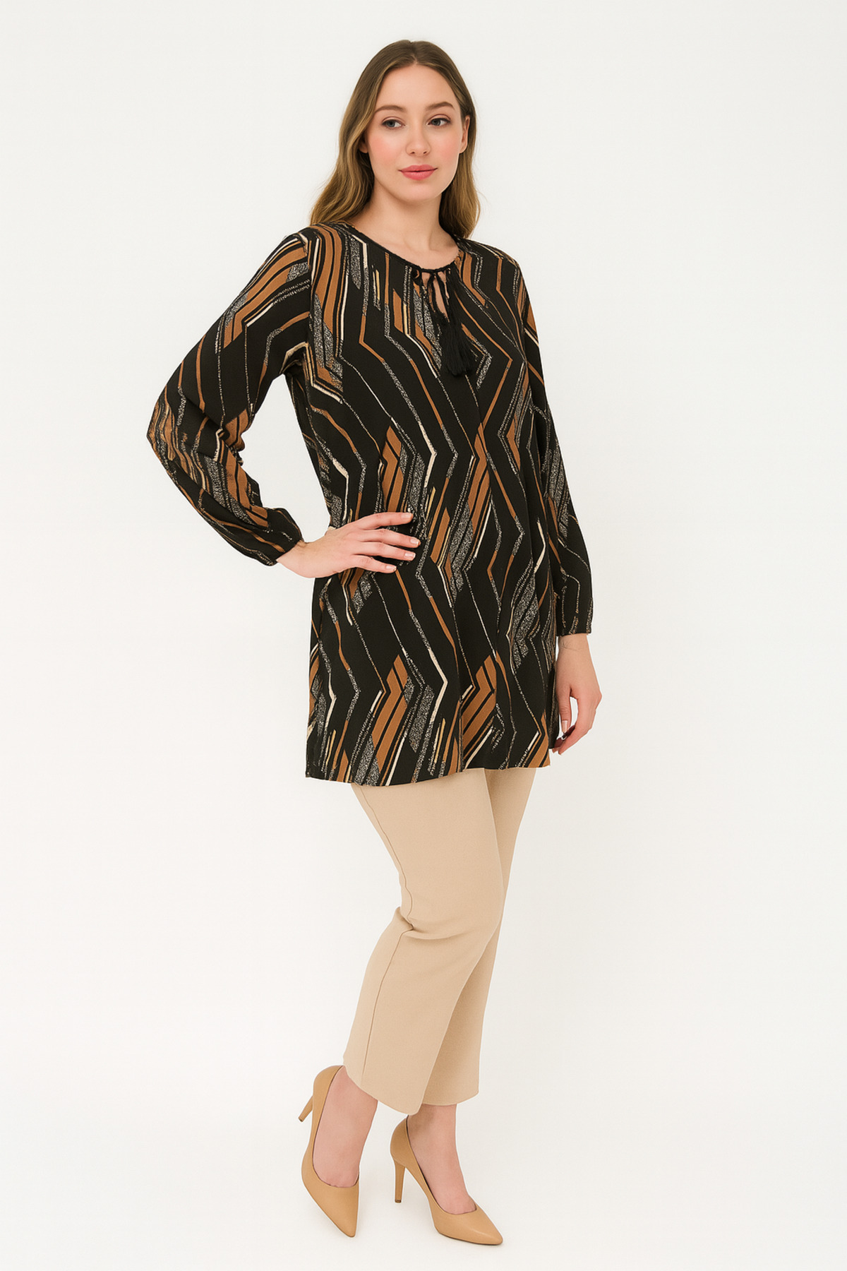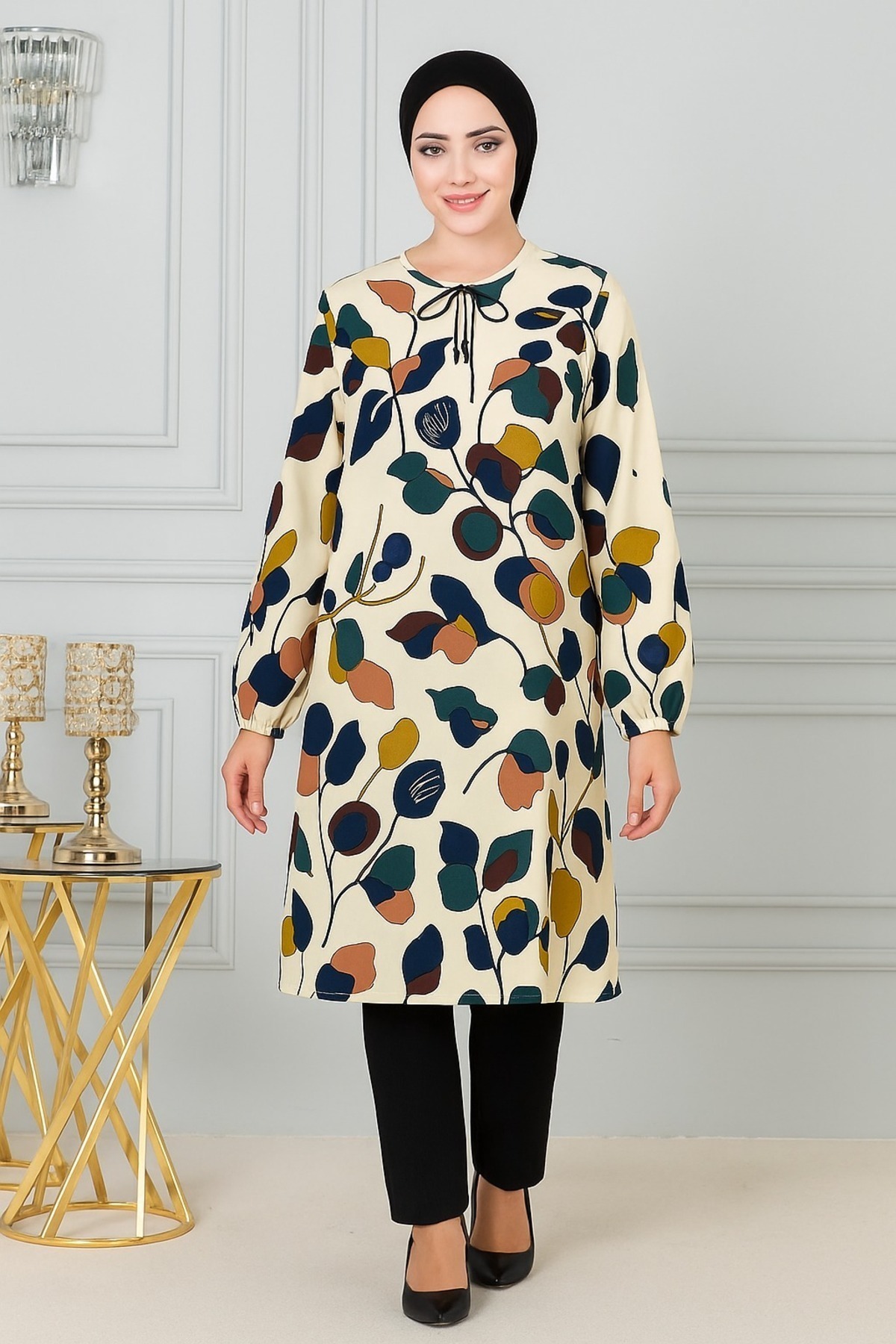 Yaprak Desenli Kadın Yazlık Tunik - Bağcıklı Yaka, Uzun Kol Yaprak Desenli Kadın Yazlık Tunik - Bağcıklı Yaka, Uzun Kol FTLLAKADINTUNIKYAZLIK 42