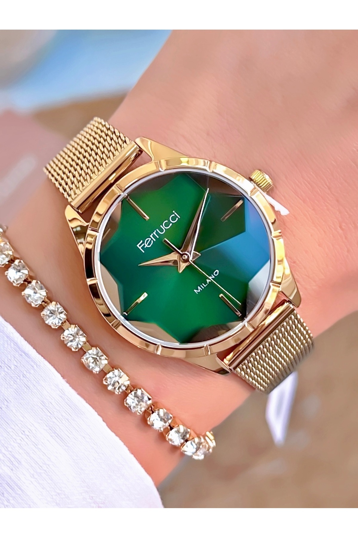 Yuvarlak Zincir Kordon Vintage Gold İçi Yeşil Kadın Kol Saati Yuvarlak Zincir Kordon Vintage Gold İçi Yeşil Kadın Kol Saati TD1396 تک سایز