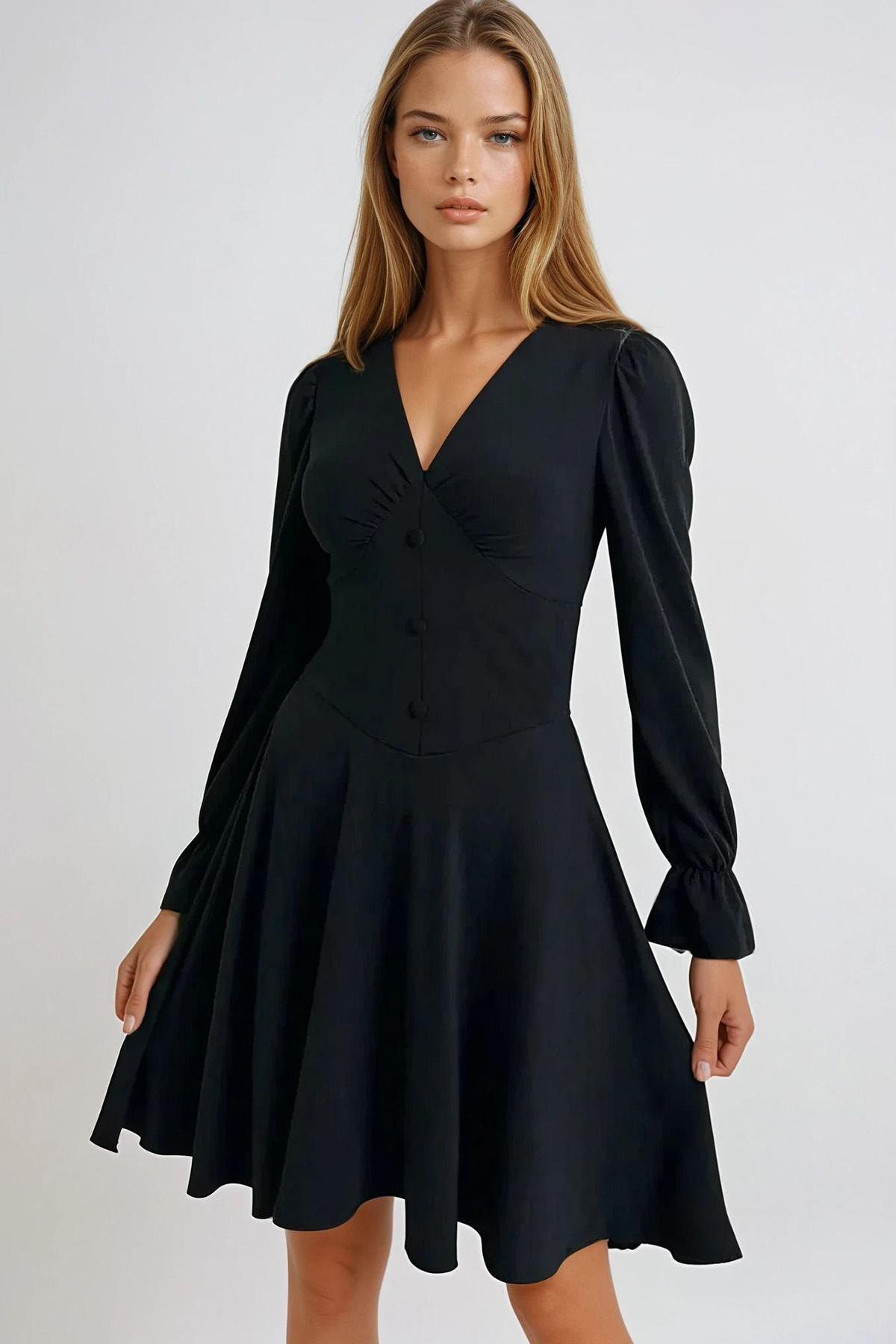 Premium Seri Düğme Detay Kuşaklı Siyah Elbise Premium Seri Düğme Detay Kuşaklı Siyah Elbise ELB-0692-SYH XL
