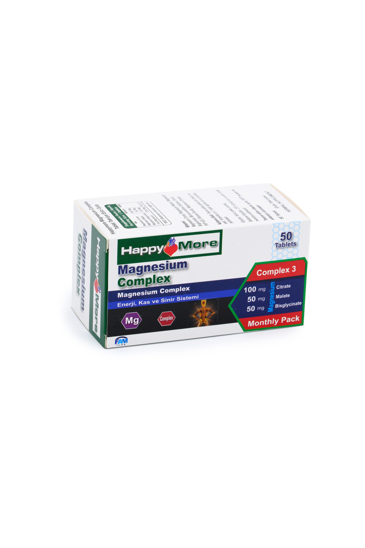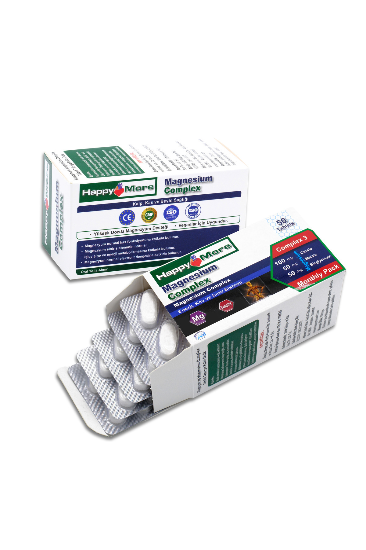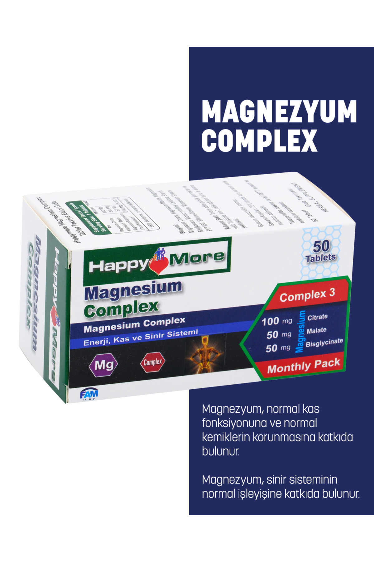 - Diğer Özellikler : HappyMore Magnezyum Complex içeriğinde Magnezyum Sitrat, Magnezyum Malat ve Magnezyum Bisglisinat bulunan bir gıda takviyesidir. HappyMore Magnezyum Complex; gluten, laktoz, tatlandırıcı, şeker, renklendiirici ve koruyucu içermez.
