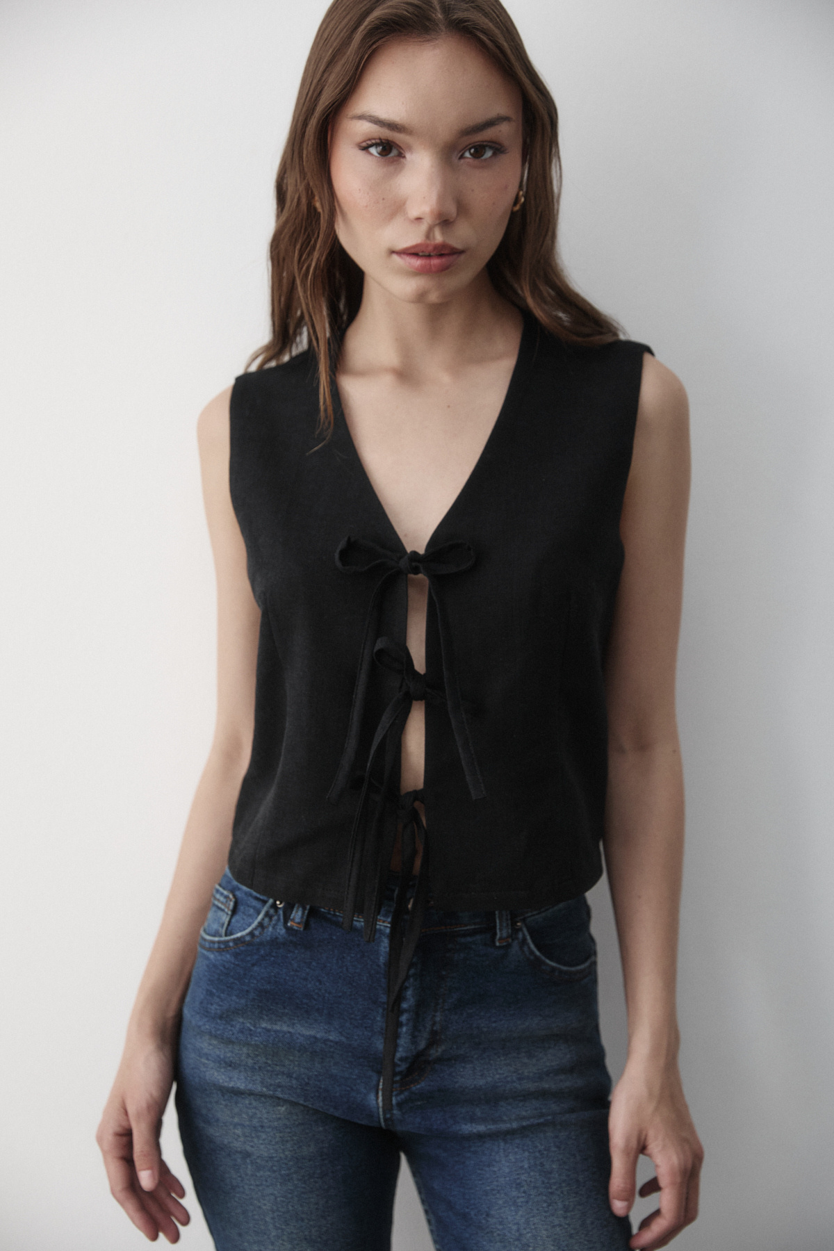 Kadın Siyah Bağlamalı Keten Yelek Kadın Siyah Bağlamalı Keten Yelek 7539 XL