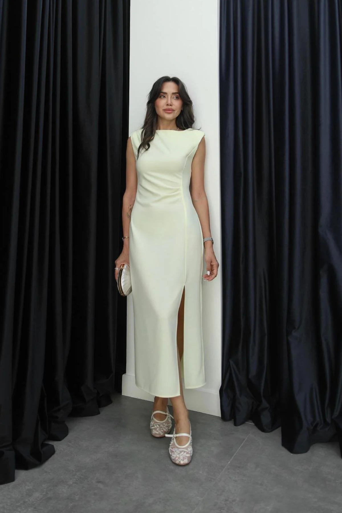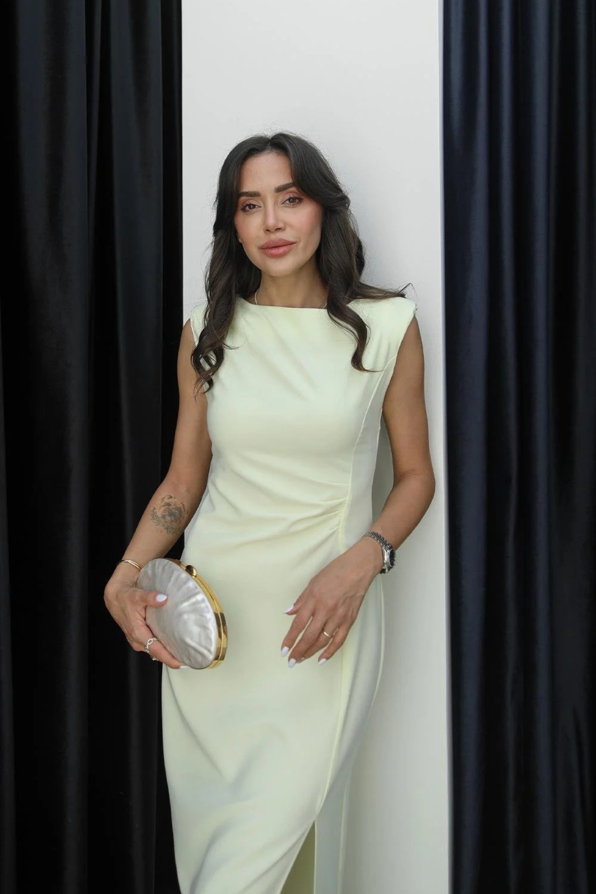 Drape Detaylı Yırtmaçlı Sarı Midi Elbise Drape Detaylı Yırtmaçlı Sarı Midi Elbise AventienElb4 L