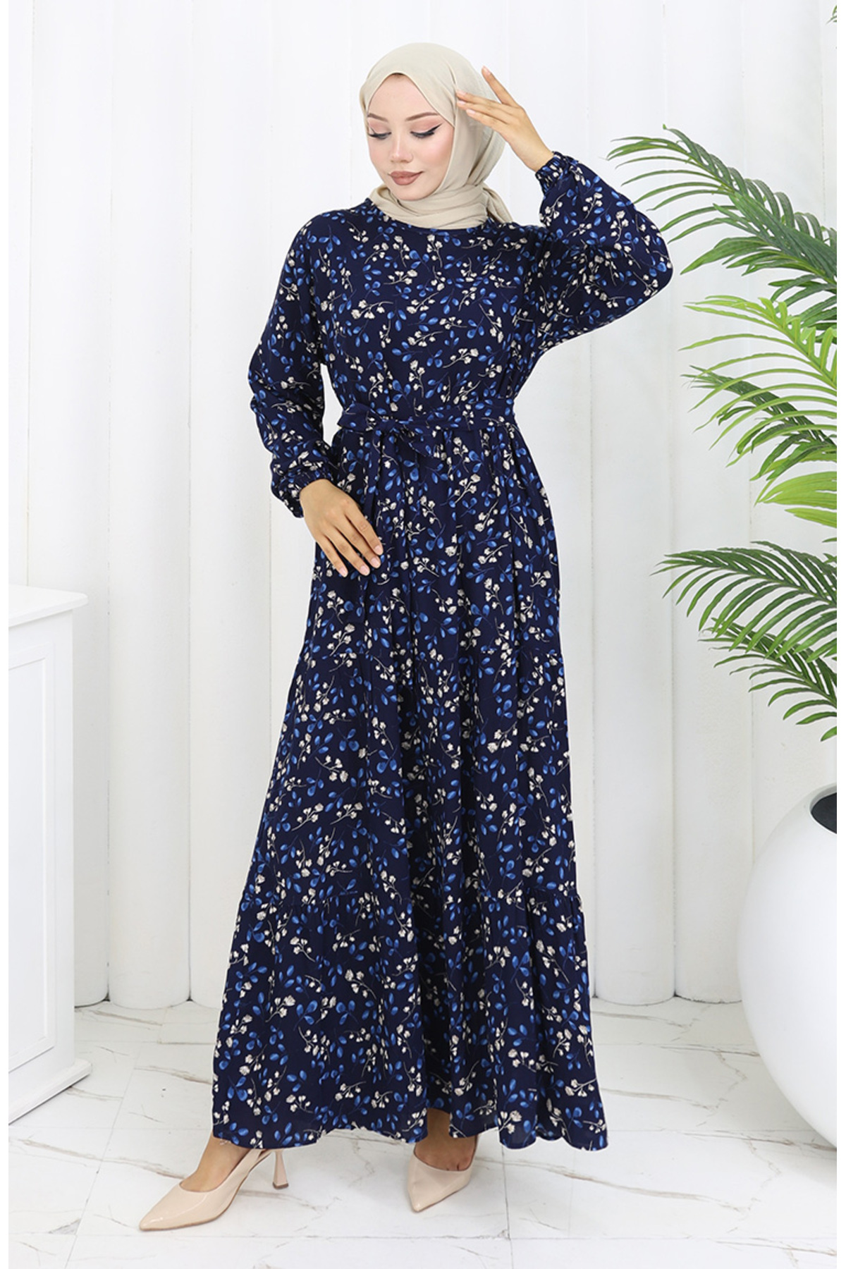 Beli Bağcıklı Desenli Viskon Elbise 2083-04 İndigo Beli Bağcıklı Desenli Viskon Elbise 2083-04 İndigo ZEMHERİ2083-04 50-52