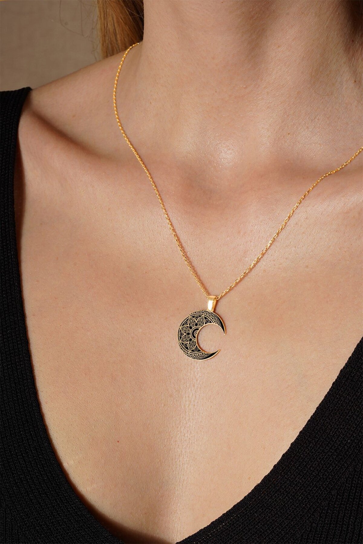 Desenli Hilal Model Siyah Mineli Gümüş Kolye-Altın Rengi Desenli Hilal Model Siyah Mineli Gümüş Kolye-Altın Rengi KLYS1061 تک سایز