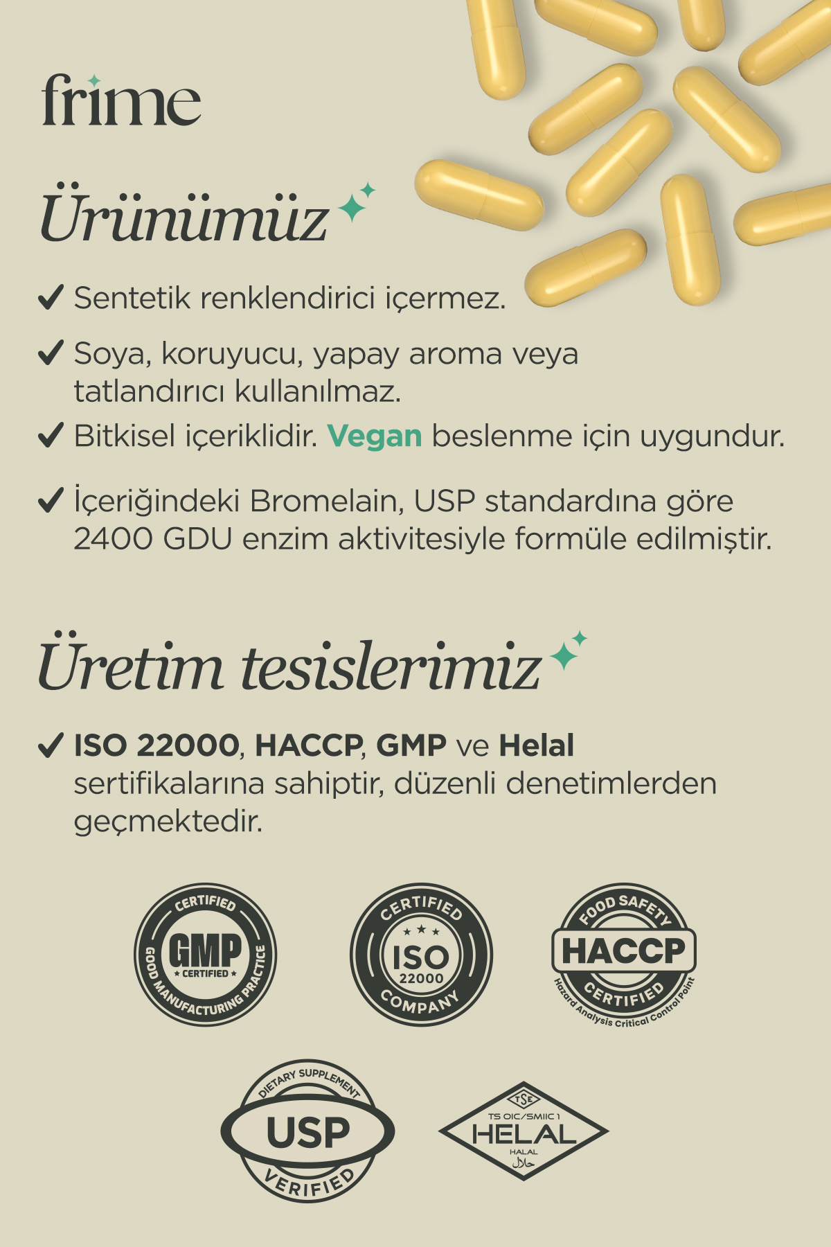 - Diğer Özellikler : Bromelain, Yeşil Çay Ekstresi, İnülin Prebiyotik , Postbiyotik