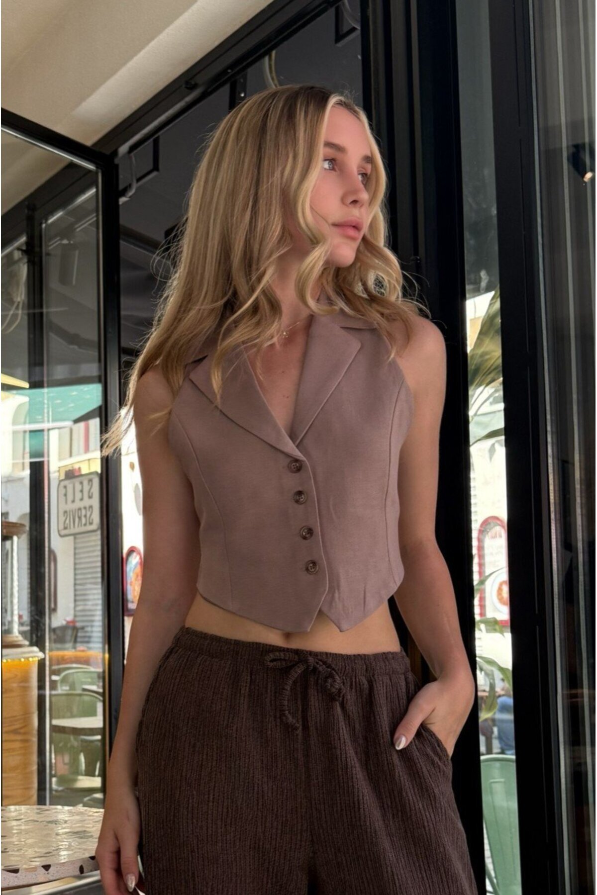 Arkadan Bağlamalı Vizon Keten Yelek Arkadan Bağlamalı Vizon Keten Yelek 0029 XL