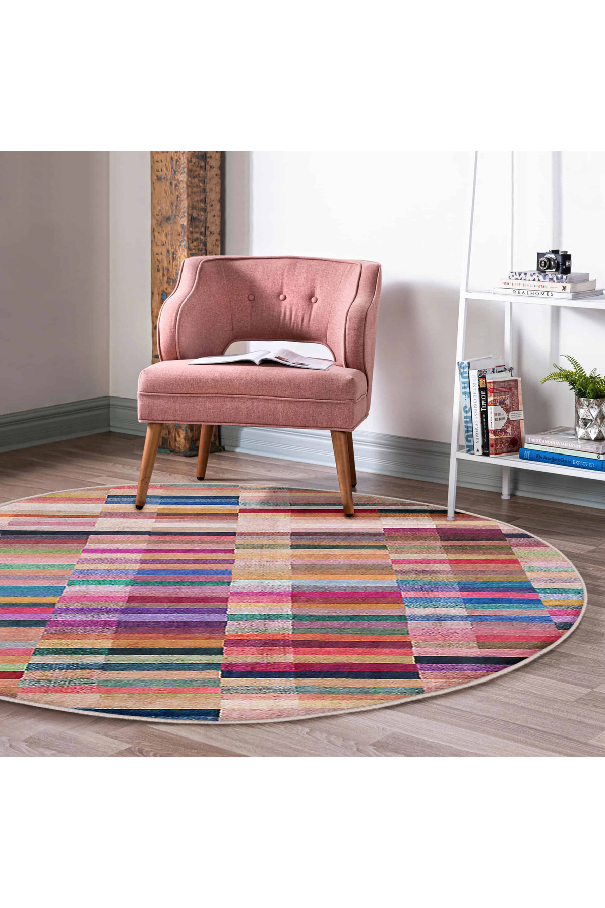 Renkli Şerit Desenli Yuvarlak Modern Salon Halısı - Yıkanabilir Kaymaz Tabanlı Şıklık Renkli Şerit Desenli Yuvarlak Modern Salon Halısı - Yıkanabilir Kaymaz Tabanlı Şıklık HaliYuv-Comfort-11219 180 x 180
