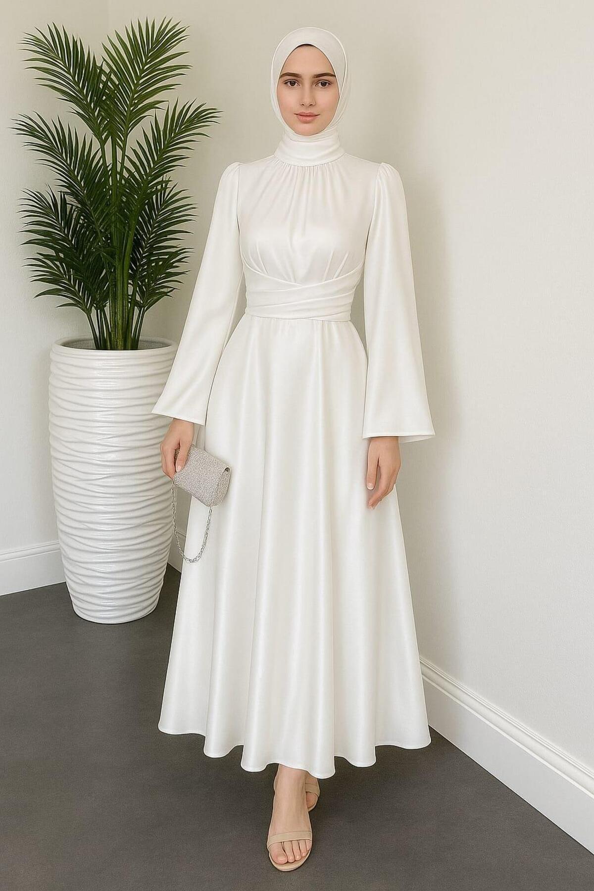 Ispanyol Kol Saten Abiye Elbise Beyaz Ispanyol Kol Saten Abiye Elbise Beyaz VİOLET1 40