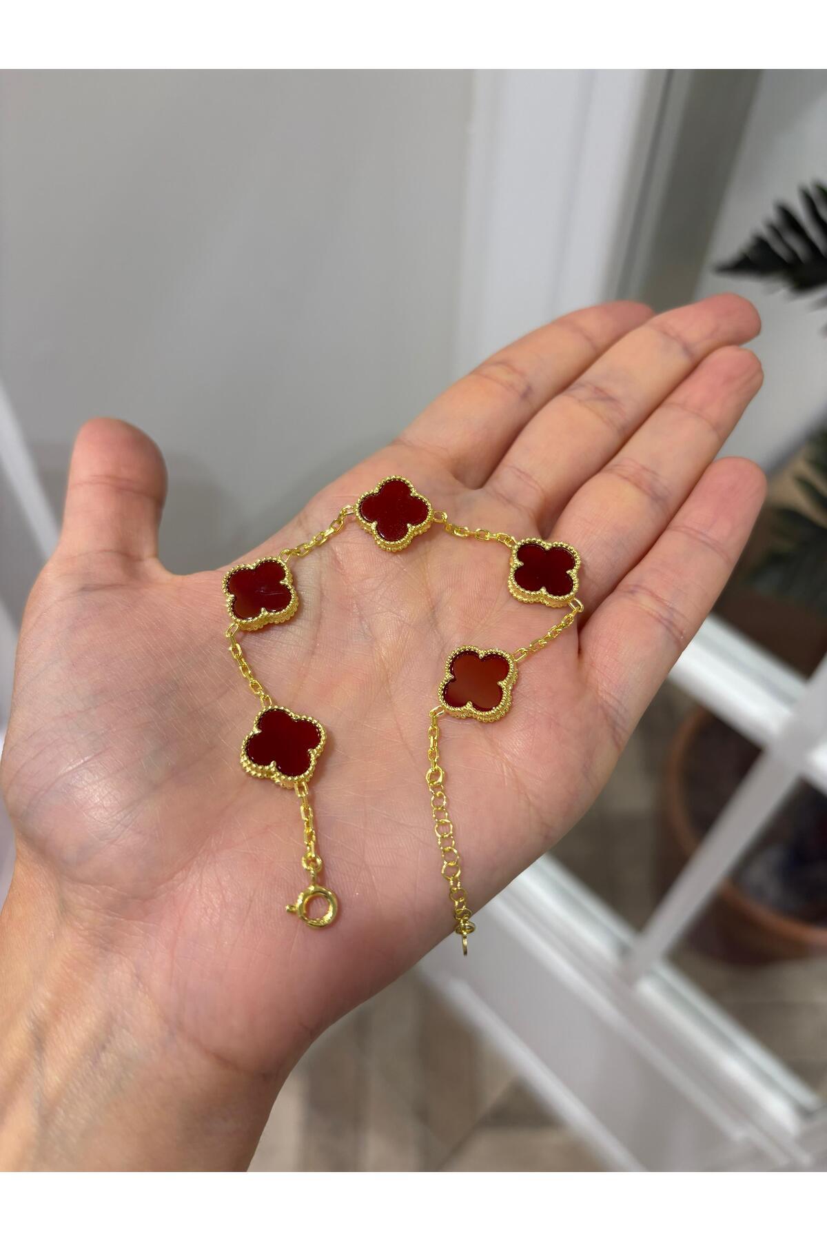 (Çantalı KUTU) 925 Ayar Gümüş 18 ayar Gold Kaplama 3 sıra Bordo Taşlı Yonca Bileklik (Çantalı KUTU) 925 Ayar Gümüş 18 ayar Gold Kaplama 3 sıra Bordo Taşlı Yonca Bileklik cantalıyonca3sırabıleklık تک سایز