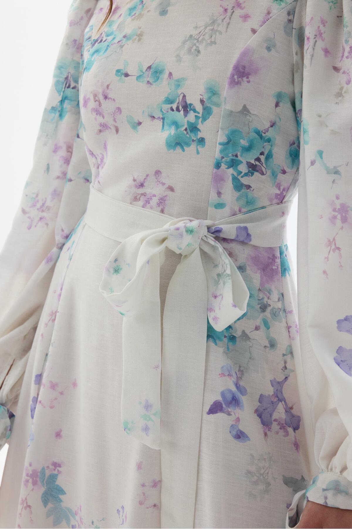 Balon Kol Çiçekli Keten Elbise Mavi Balon Kol Çiçekli Keten Elbise Mavi 9963 L