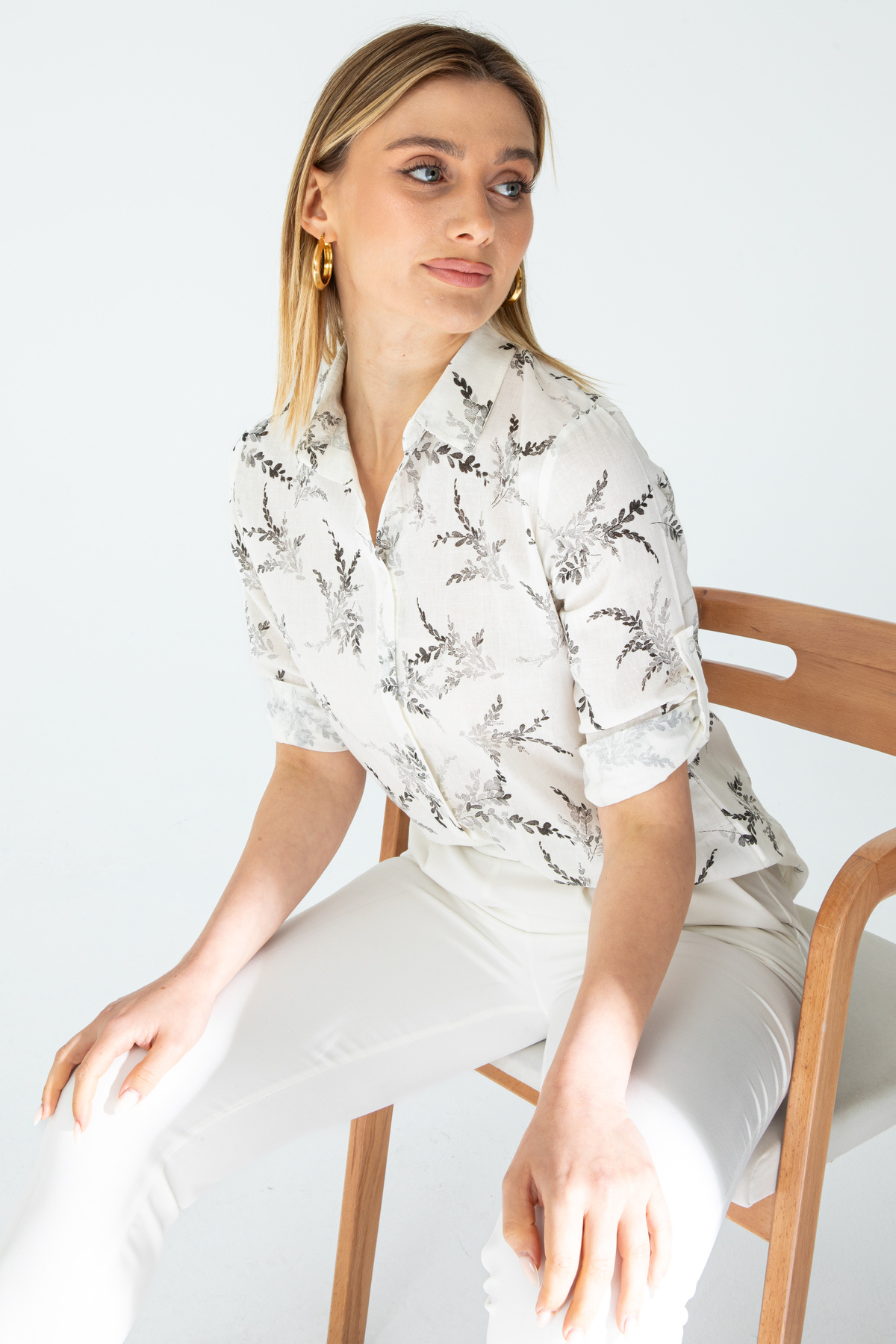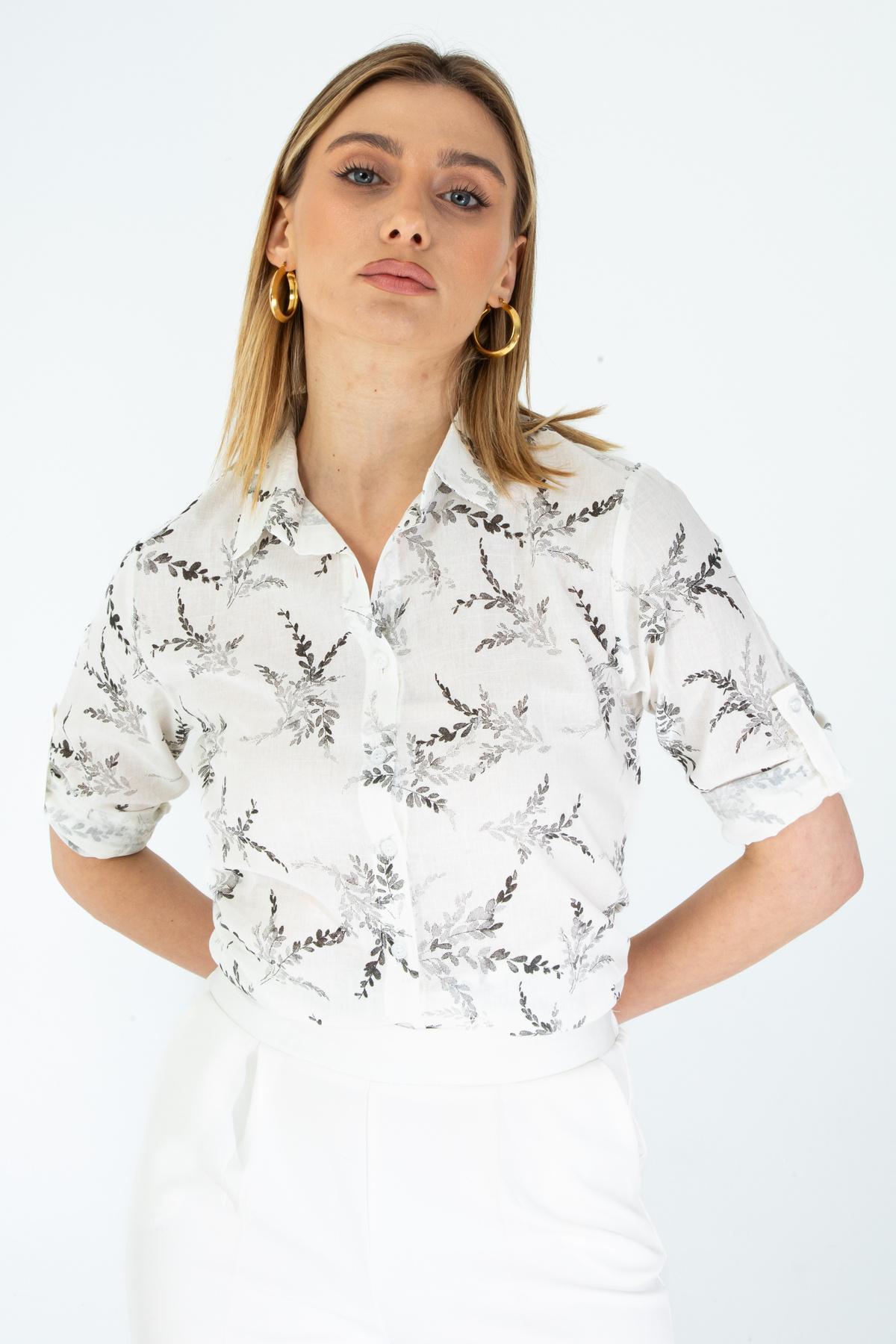 Kadın Beyaz Çiçek Desenli Şık Kol Katlamalı Keten Gömlek Kadın Beyaz Çiçek Desenli Şık Kol Katlamalı Keten Gömlek 1500108 XL