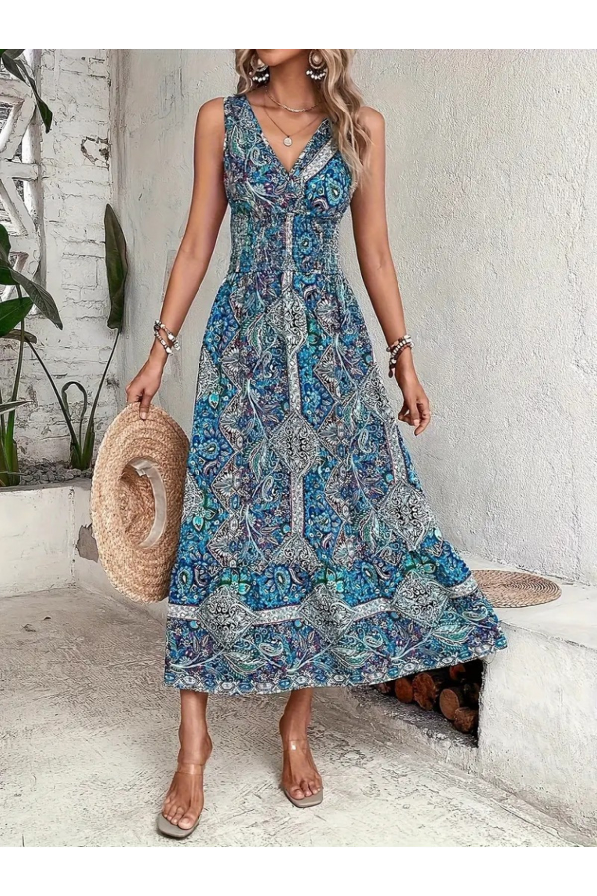Askılı Kruvaze Yaka Beli Gipeli Etnik Desenli Elbise Askılı Kruvaze Yaka Beli Gipeli Etnik Desenli Elbise 055087 2XL-3XL