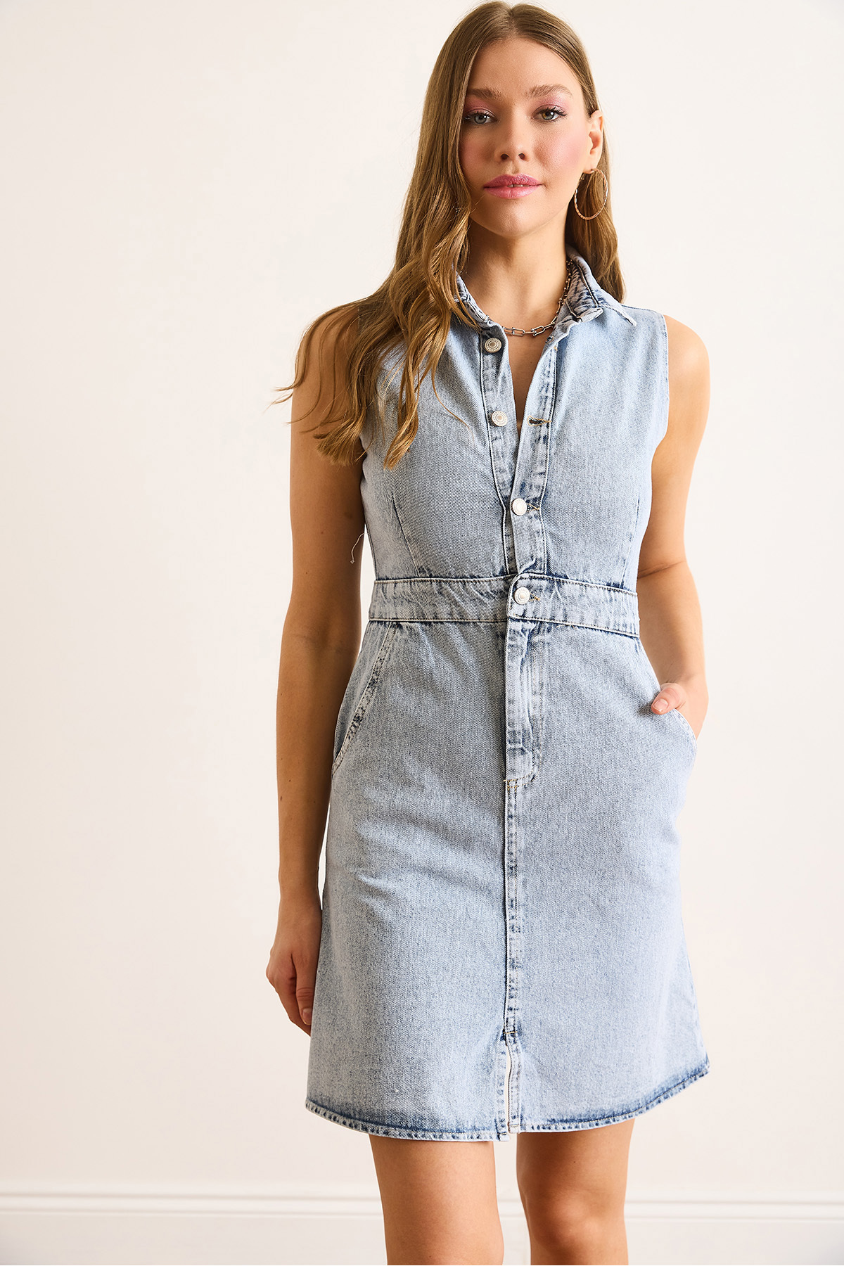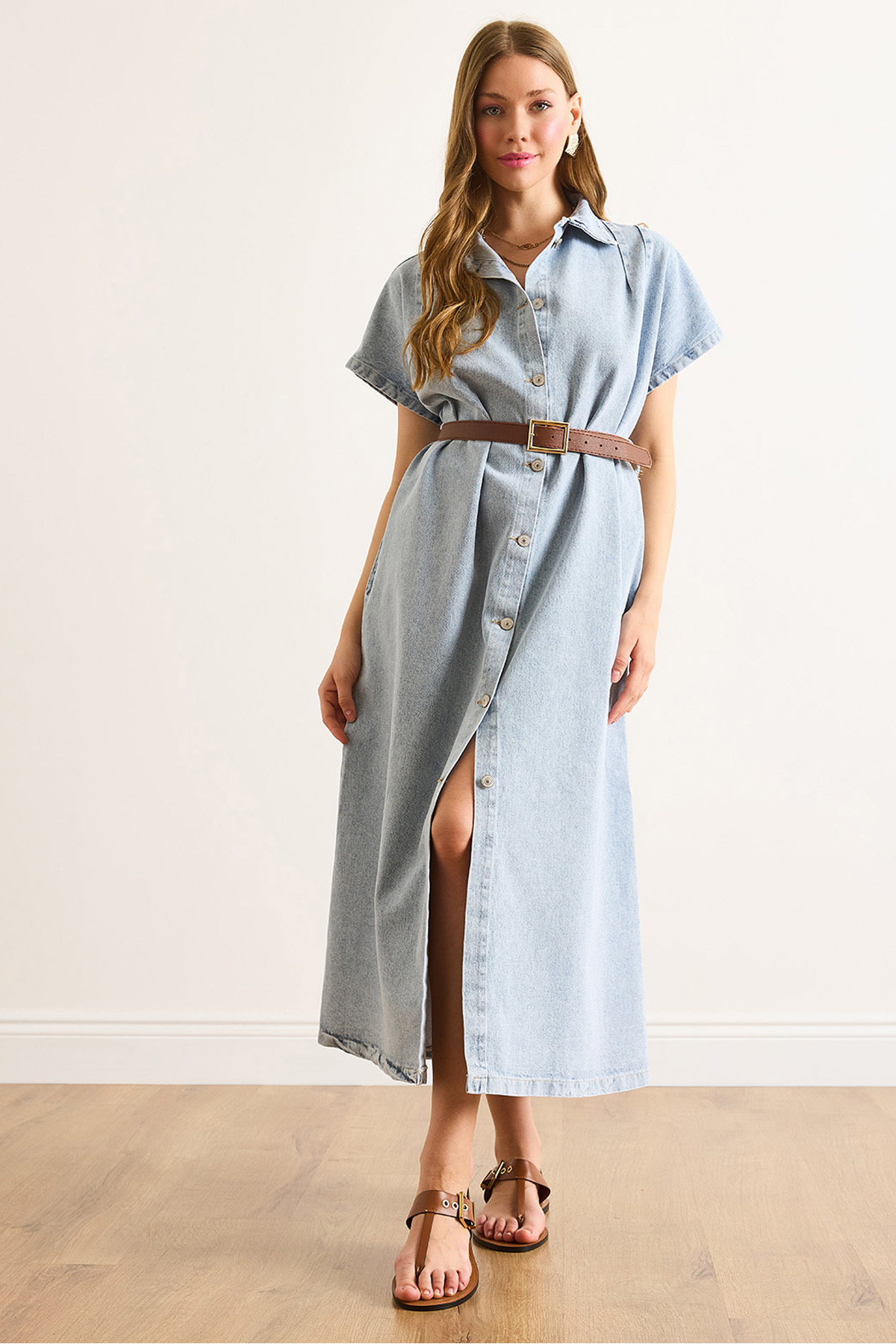 Kadın Mavi Astarı Dikili Kemerli Müslin Gömlek Elbise ELB-19002423 Kadın Mavi Astarı Dikili Kemerli Müslin Gömlek Elbise ELB-19002423 L