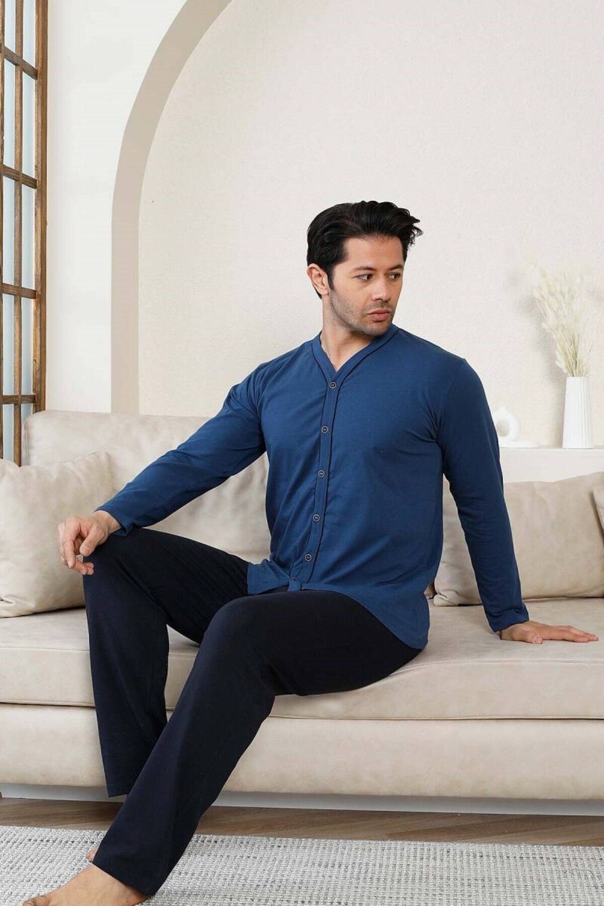 Erkek Mavi V Yaka Önden Düğmeli Pamuk Likra Mevsimlik Uzun Kol Cepli Pijama Takımı Erkek Mavi V Yaka Önden Düğmeli Pamuk Likra Mevsimlik Uzun Kol Cepli Pijama Takımı PRA-12808298-559645 2XL