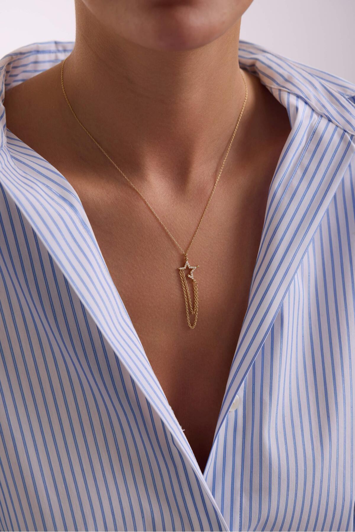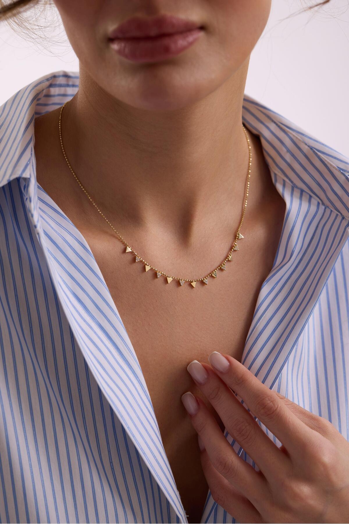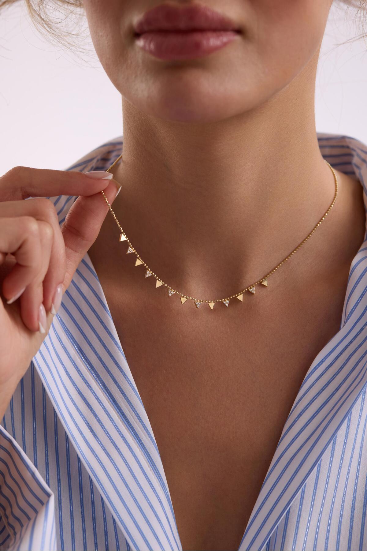 14 Ayar Sallantılı Taşlı Üçgen Uçlu Altın Kolye 14 Ayar Sallantılı Taşlı Üçgen Uçlu Altın Kolye BST0526 تک سایز