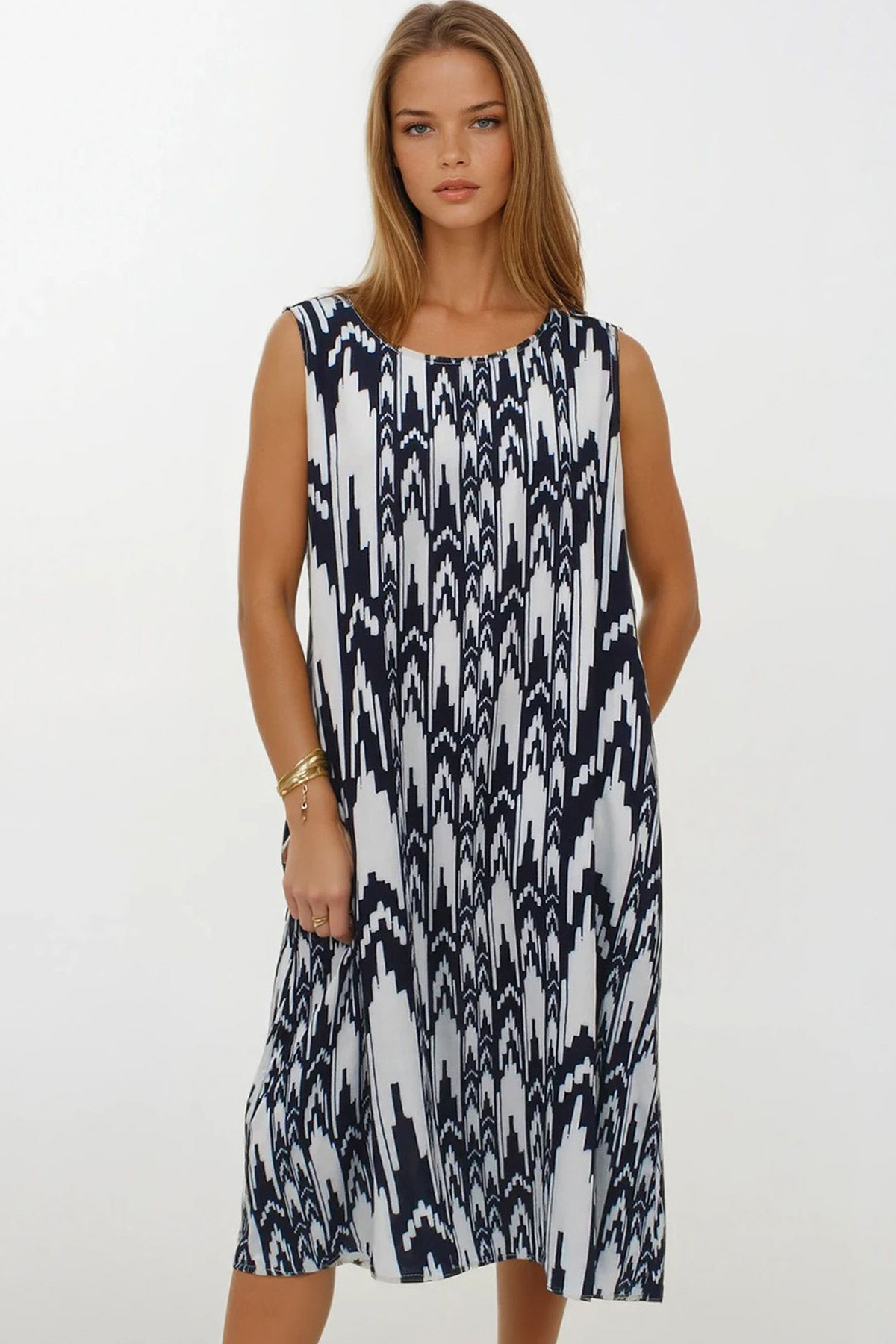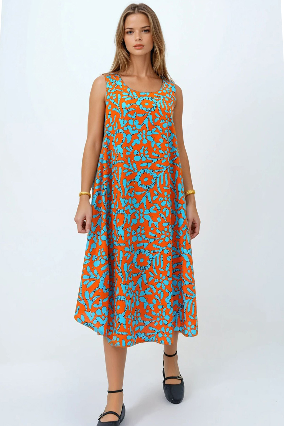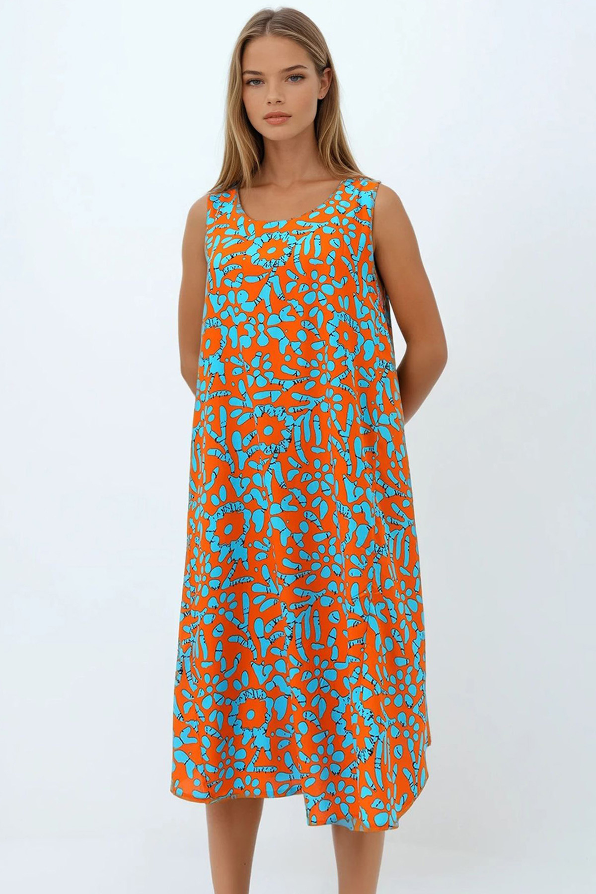 Kadın Gök Mavisi Omuzları Lastikli Kolsuz Rahat Kesim Desenli Elbise Vs00270 Kadın Gök Mavisi Omuzları Lastikli Kolsuz Rahat Kesim Desenli Elbise Vs00270 VS00270 L/XL
