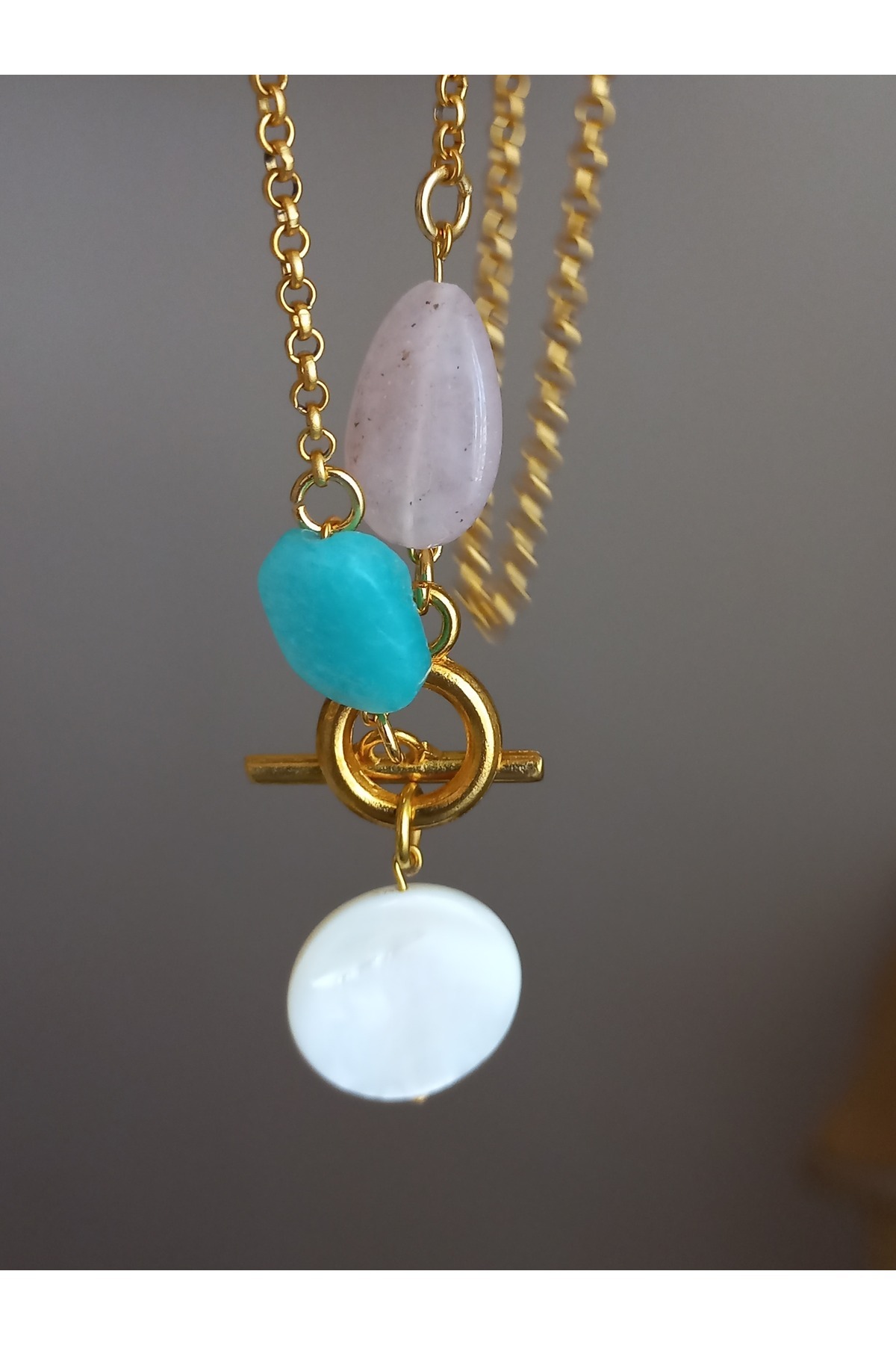 Doğal taşlı çelik kolye;Amozonit ,pembe kuvars ve ile çelik zincir üzerine tasarlamıştır. Doğal taşlı çelik kolye;Amozonit ,pembe kuvars ve ile çelik zincir üzerine tasarlamıştır. L0451 44 cm