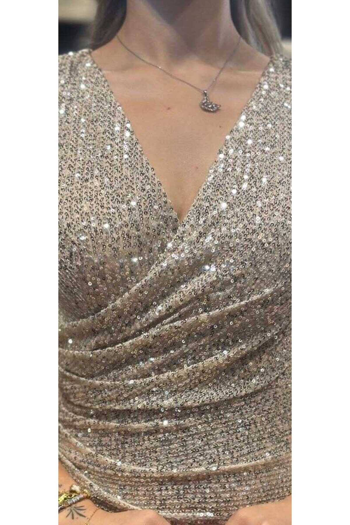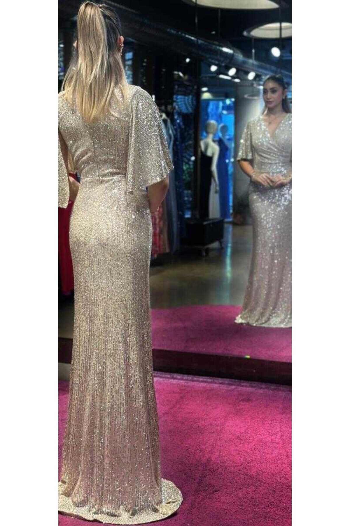 Bej Kısa Kollu Düz Kesim Payet Uzun Abiye Elbise 7572 Bej Kısa Kollu Düz Kesim Payet Uzun Abiye Elbise 7572 54