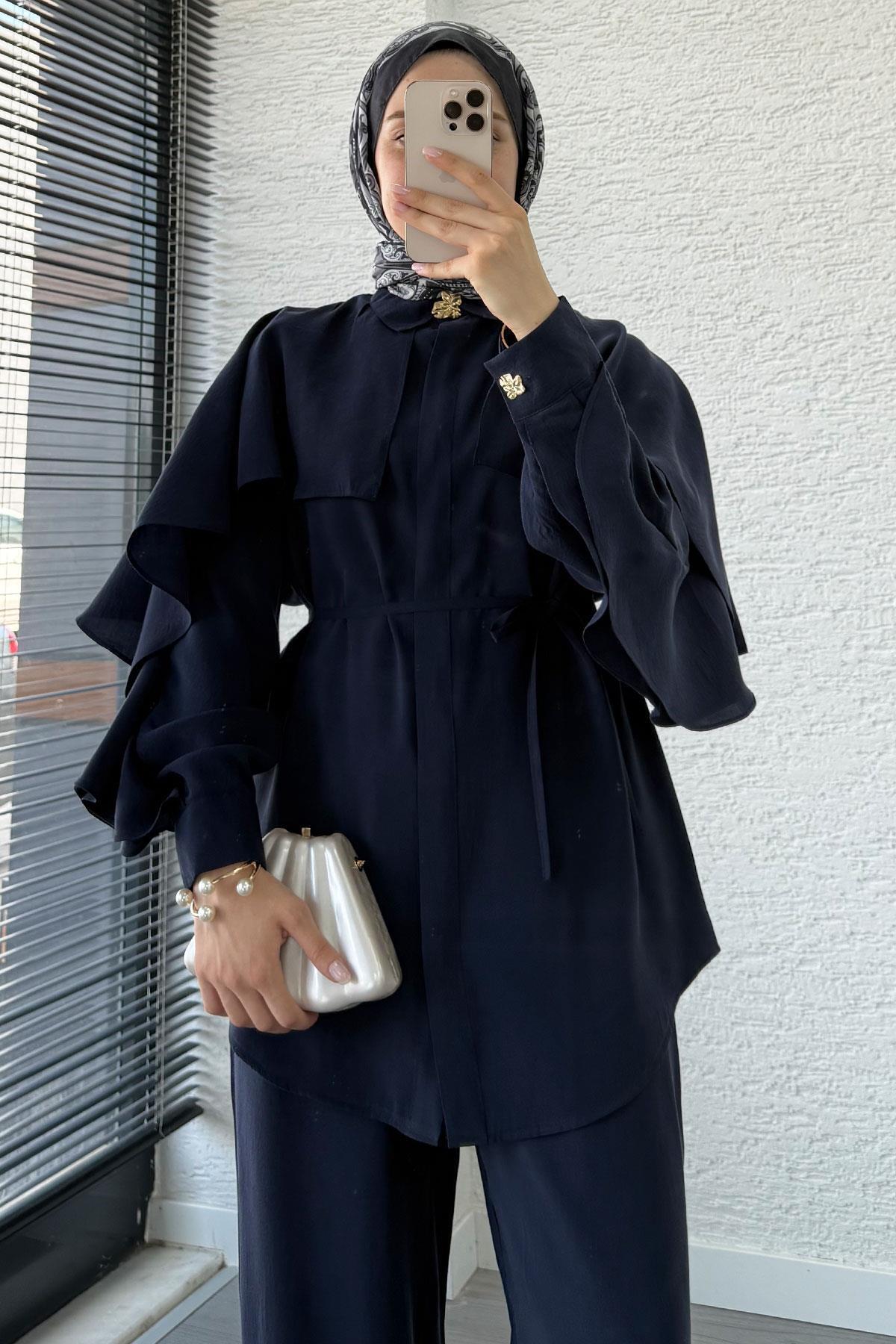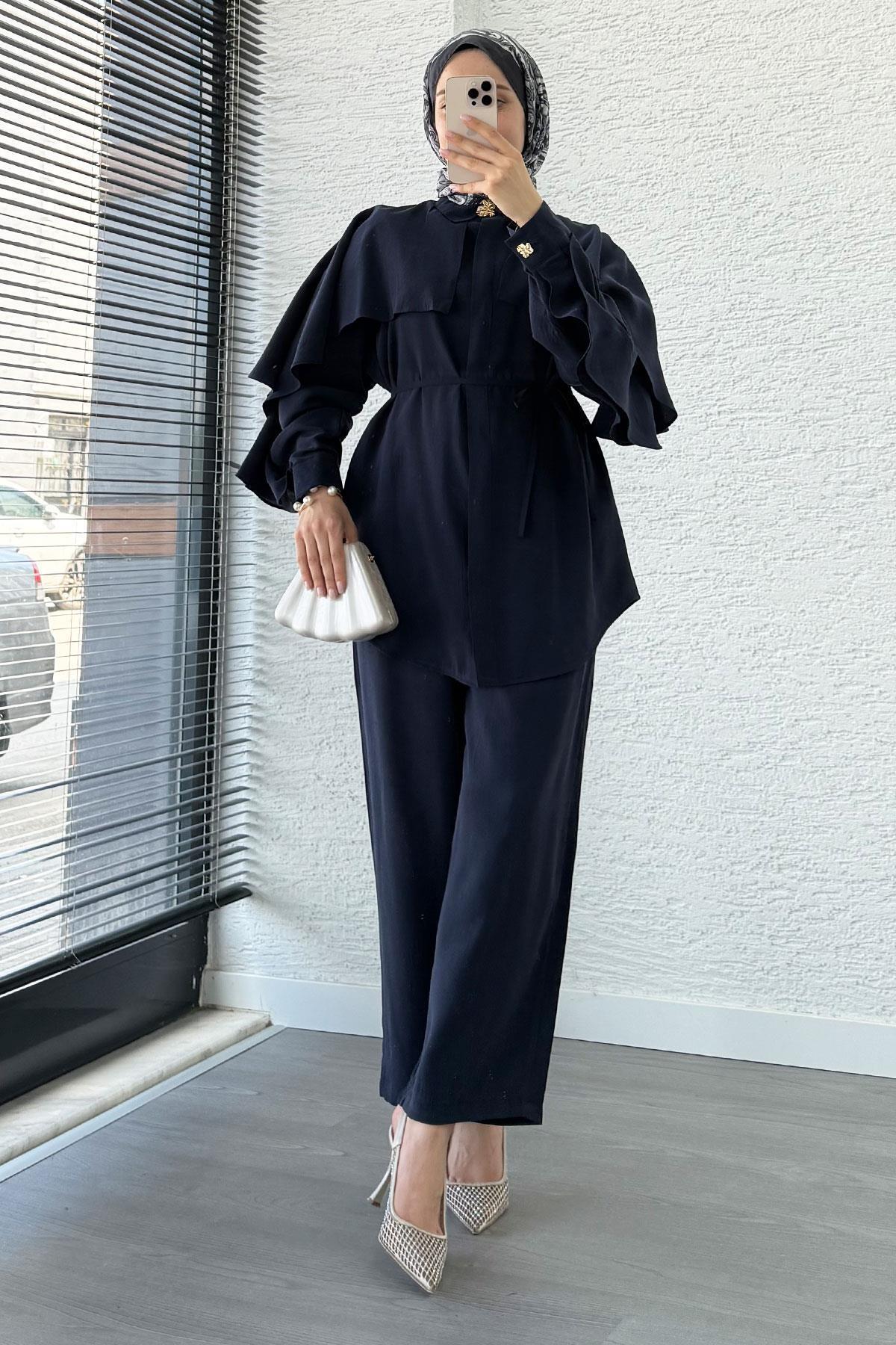 Kol Fırfır Detay Tunik Pantolon Takım -Lacivert Kol Fırfır Detay Tunik Pantolon Takım -Lacivert mlk15172 L/XL