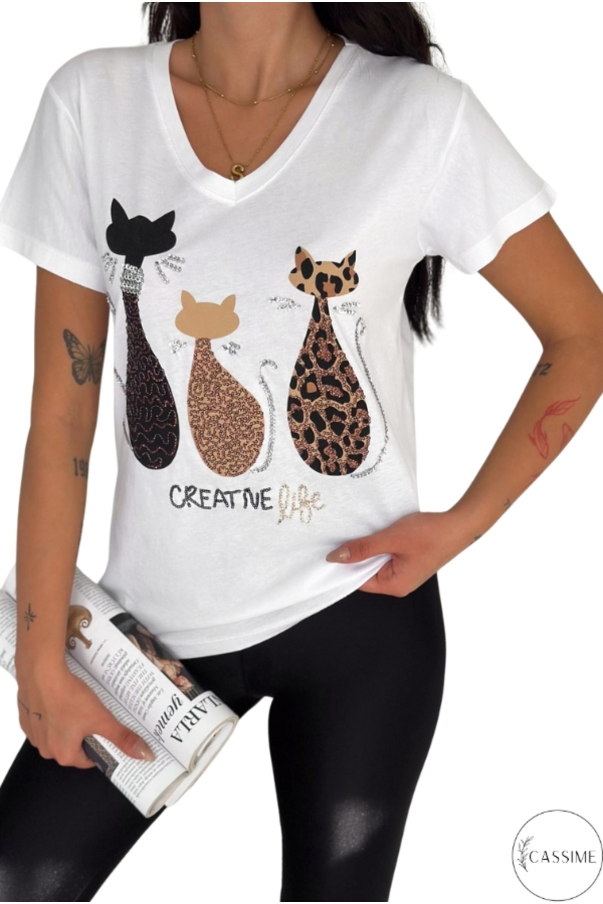 Kadın Beyaz V Yaka Kedi Leopar Pul Payet İşlemeli %100 Pamuk Tişört Büyük Beden XL-2XL-3XL Kadın Beyaz V Yaka Kedi Leopar Pul Payet İşlemeli %100 Pamuk Tişört Büyük Beden XL-2XL-3XL LDR-2025 3XL