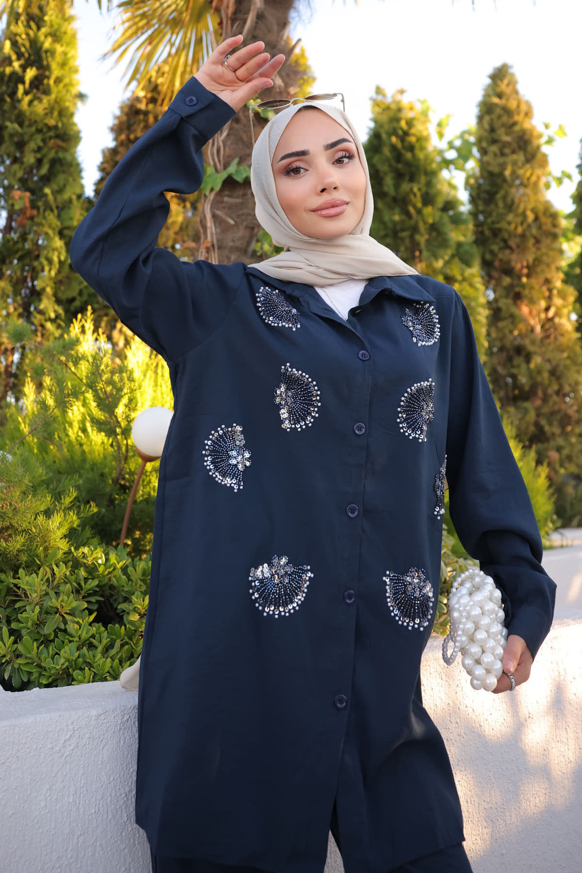 Lacivert Boncuk İşlemeli Tunik Pantolonlu Takım Lacivert Boncuk İşlemeli Tunik Pantolonlu Takım IMJ007105 46