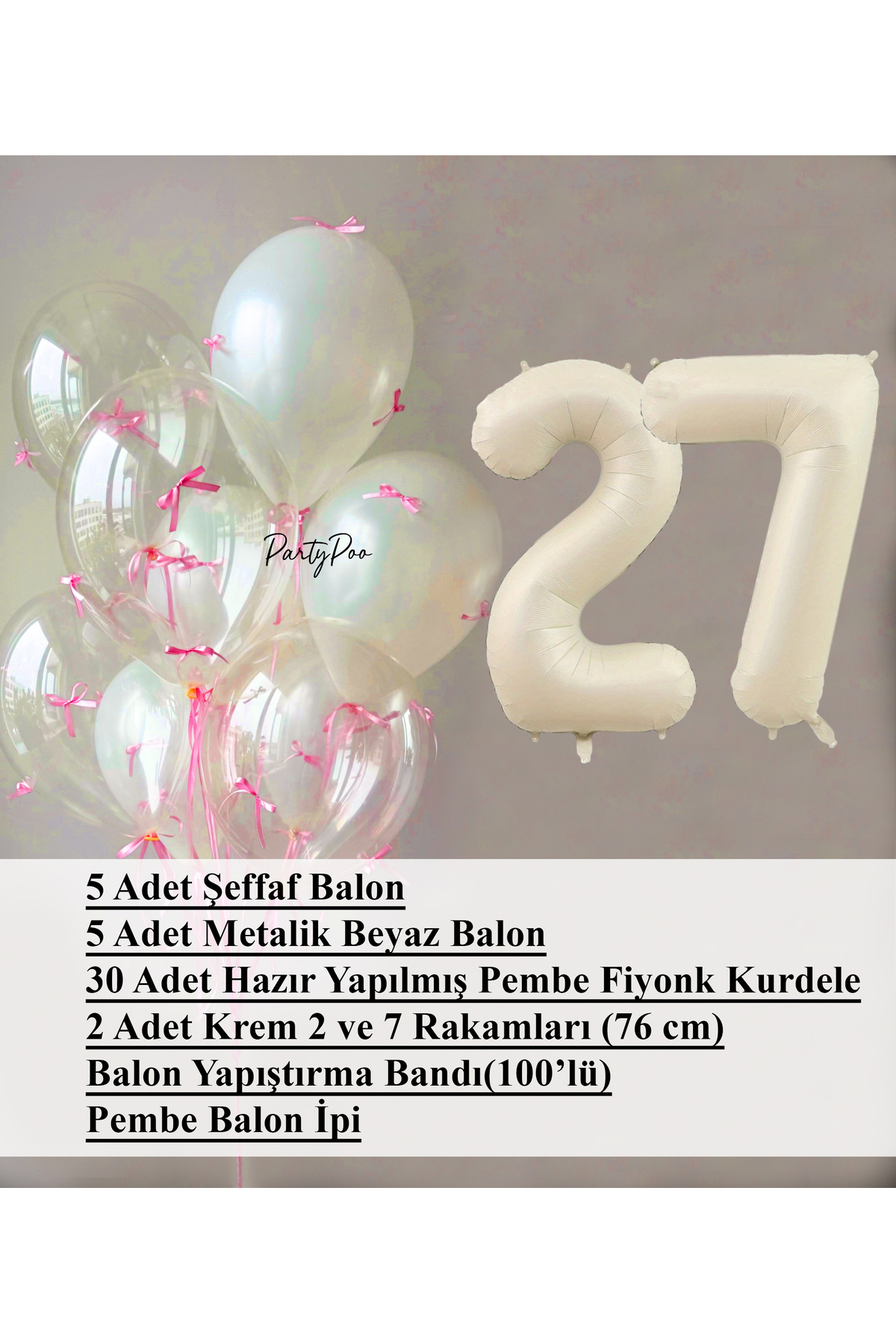 Pembe Fiyonklu Şeffaf Beyaz Balon Seti + Krem Rakam Folyo Balon – 11'li Doğum Günü Parti Süsü enyeng1a