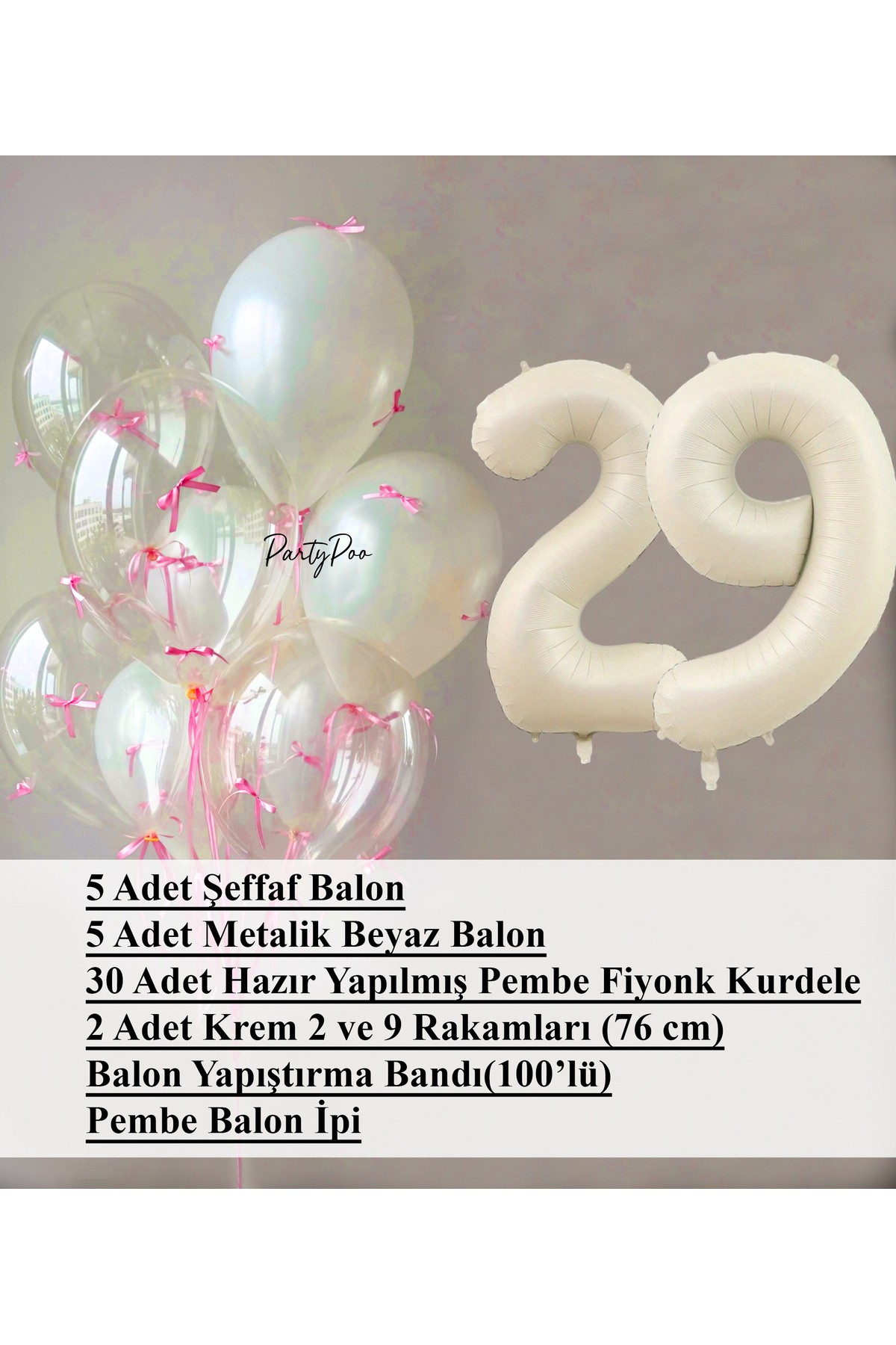 Pembe Fiyonklu Şeffaf Beyaz Balon Seti + Krem Rakam Folyo Balon – 11'li Doğum Günü Parti Süsü enyeng1a