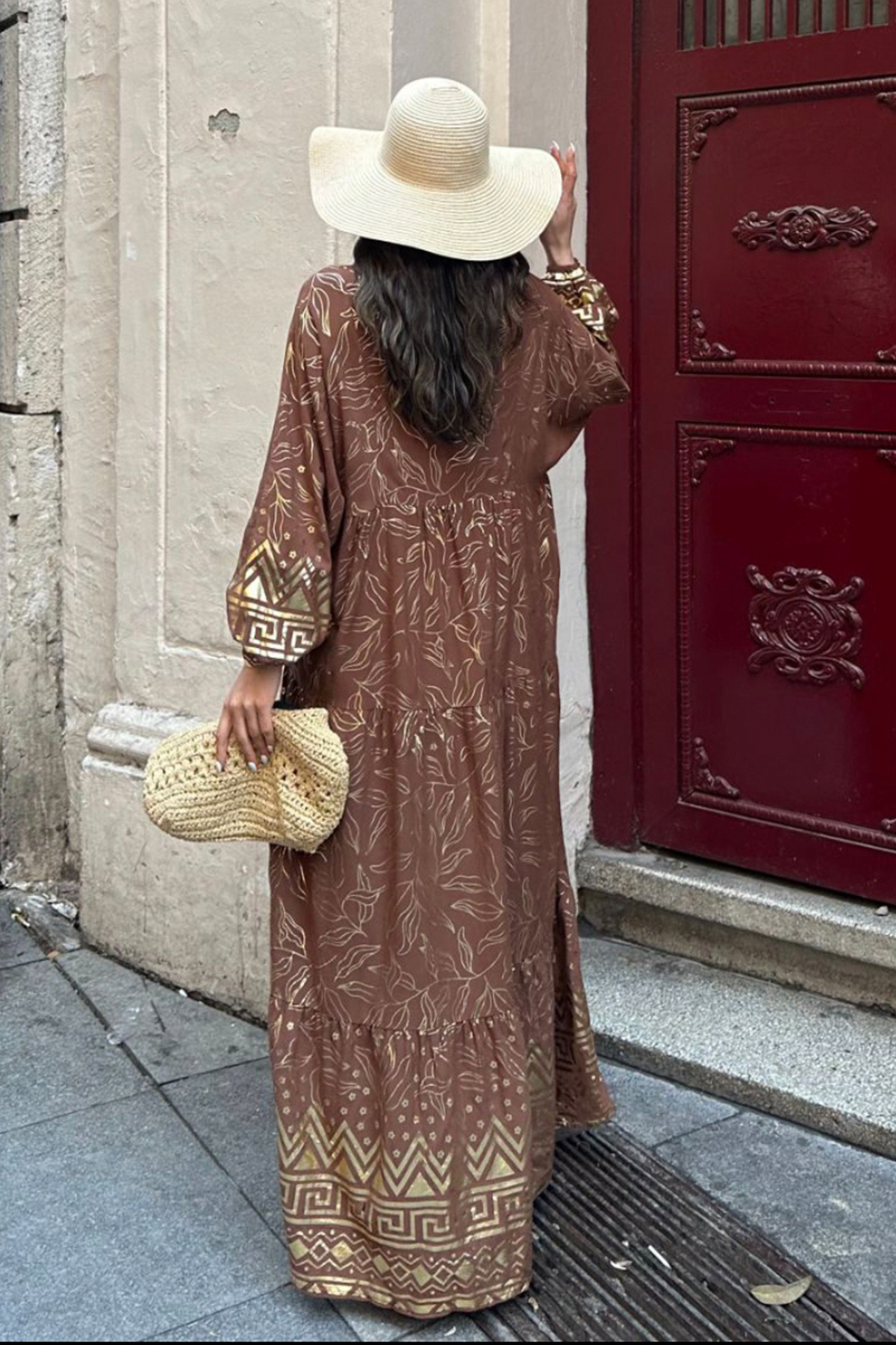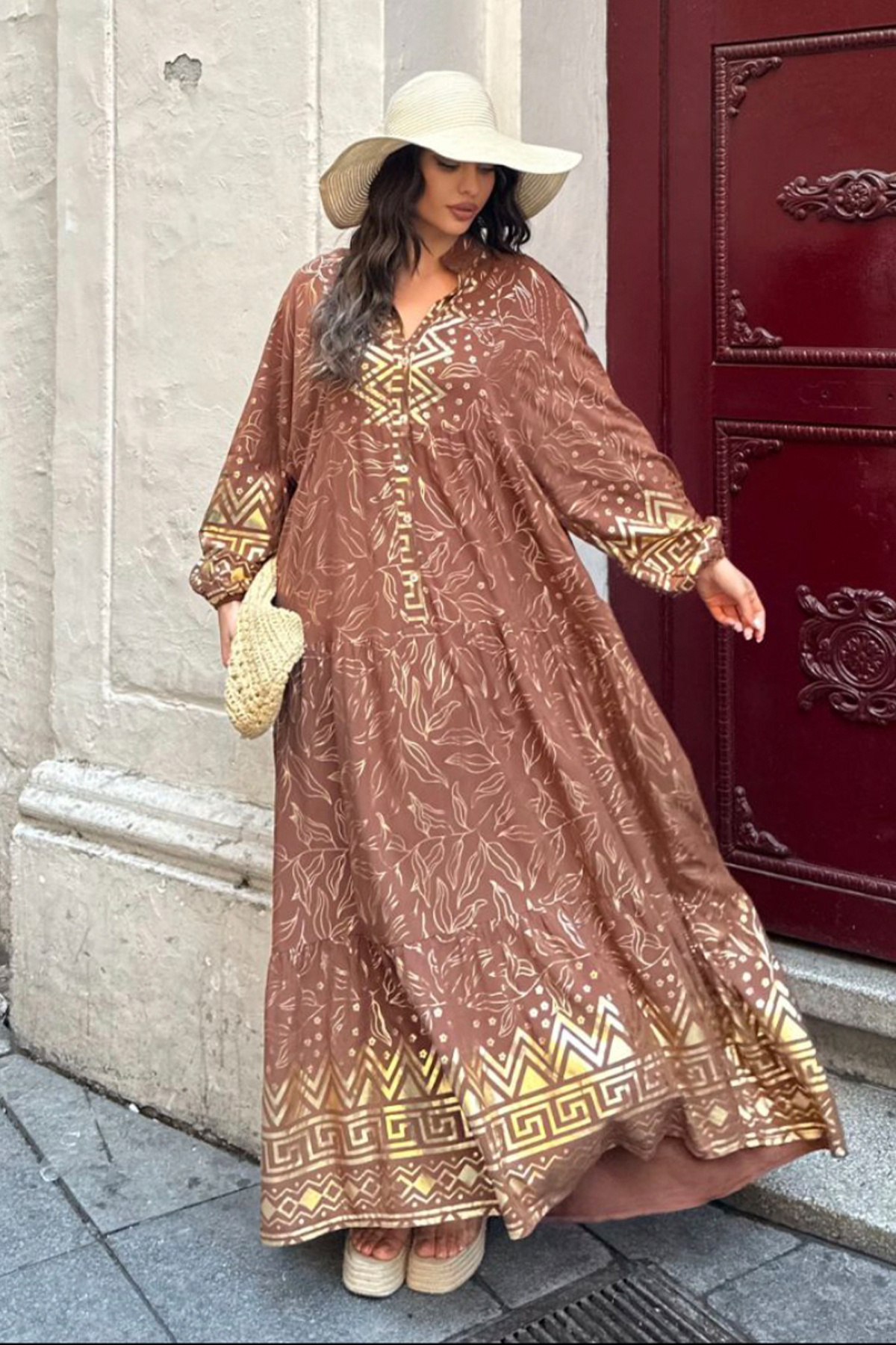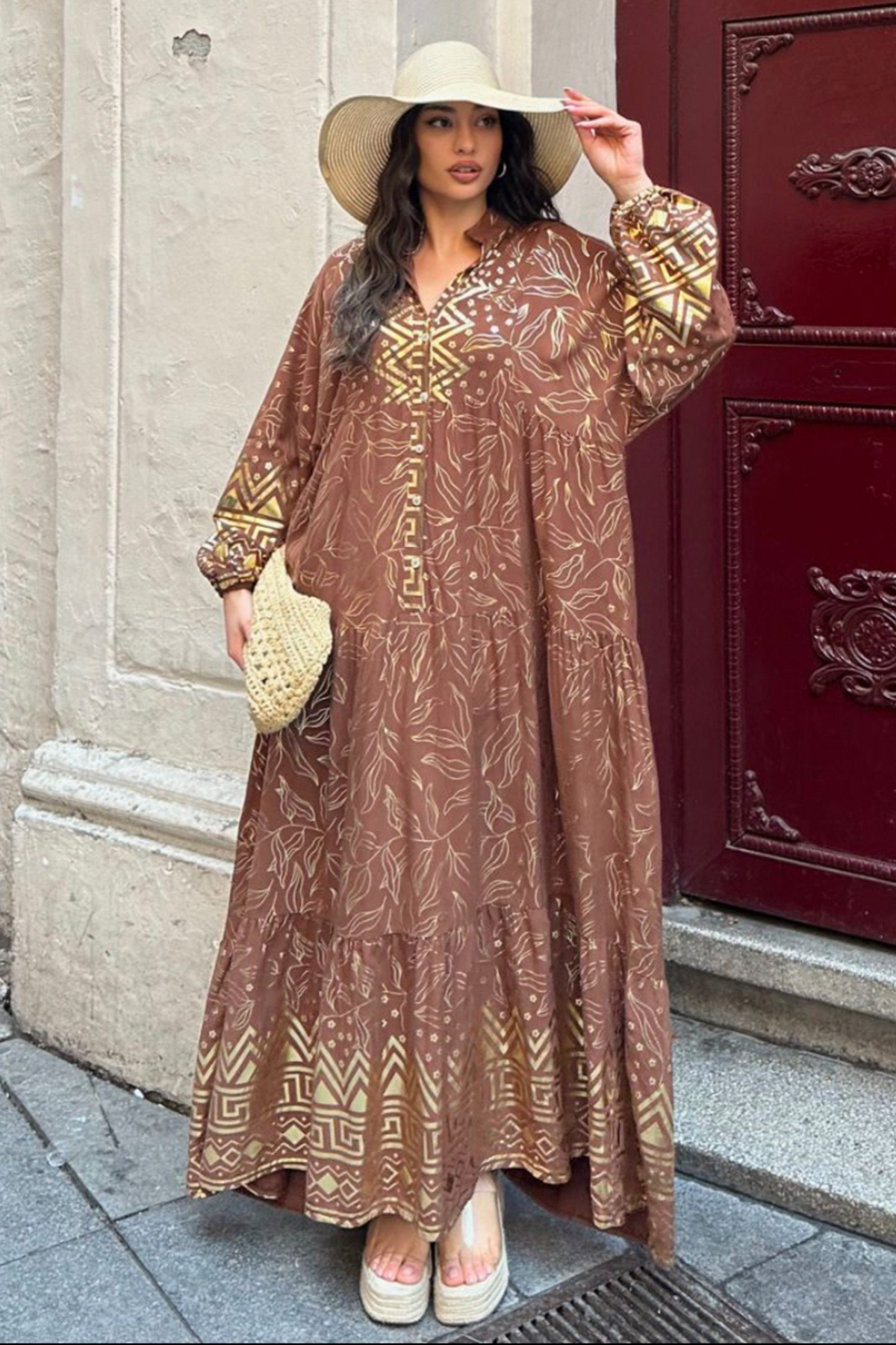 Kadın Kahverenk Patlı Yakalı Varaklı Parlaka Desenli Balon Kollu Uzun Etnik Otantik Uzun Elbise Kadın Kahverenk Patlı Yakalı Varaklı Parlaka Desenli Balon Kollu Uzun Etnik Otantik Uzun Elbise 2056VARAKLI-BESTELLA 2XL