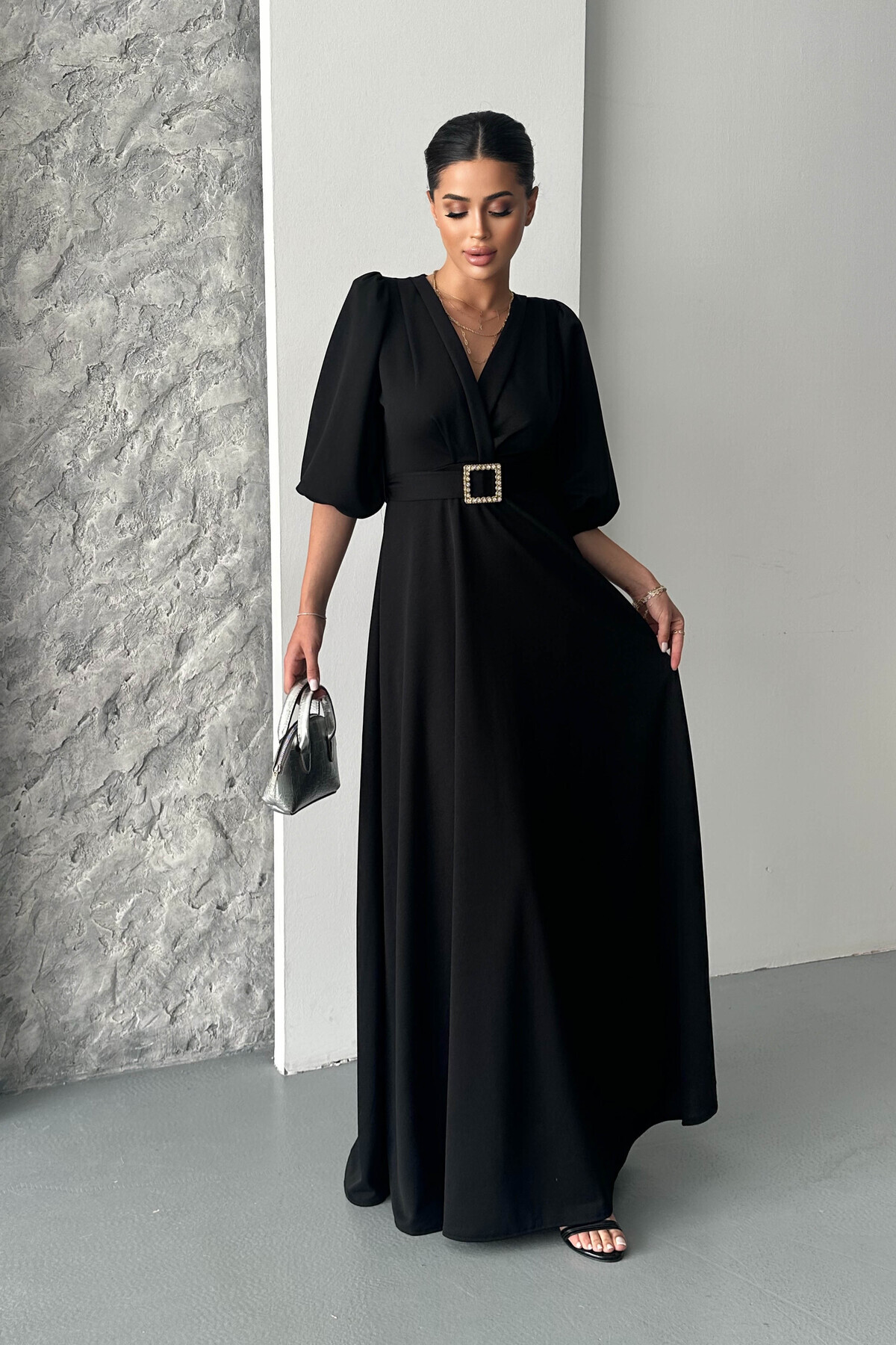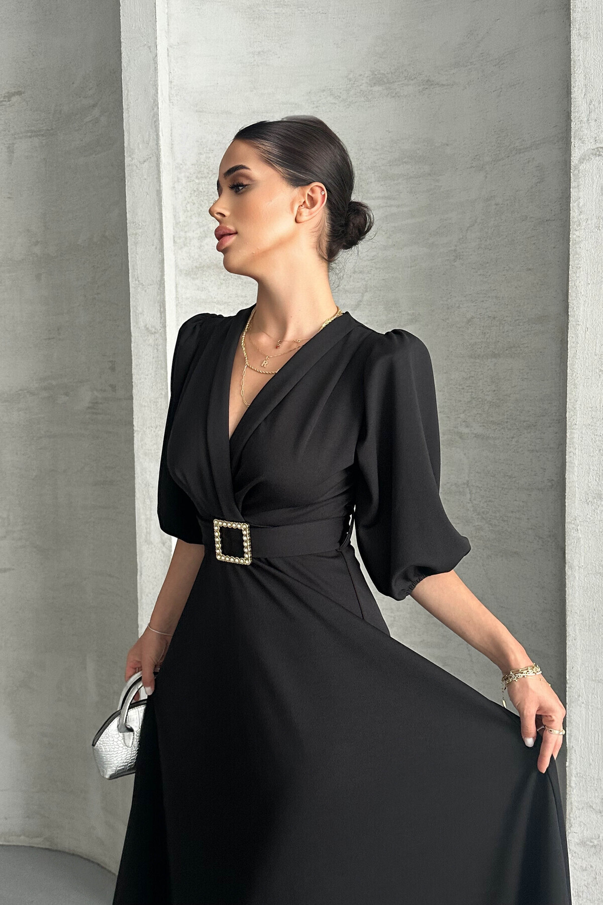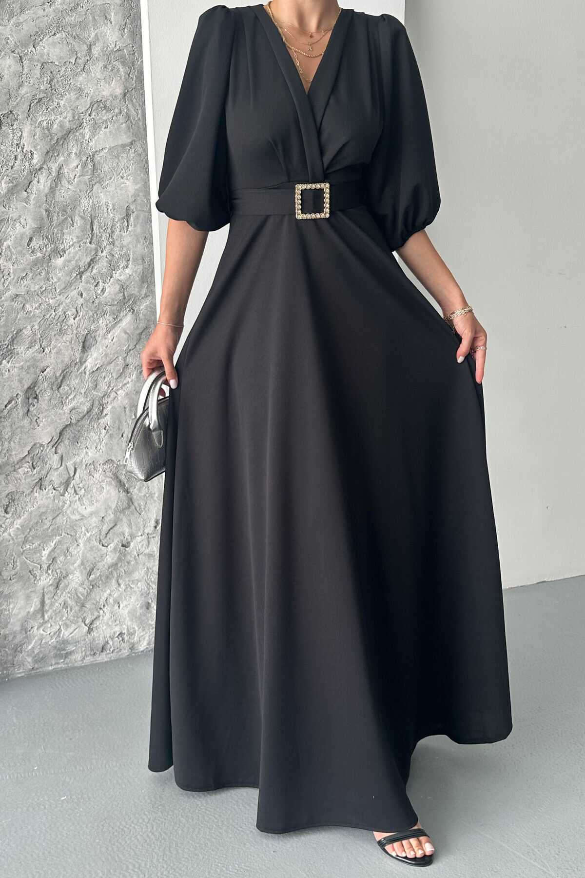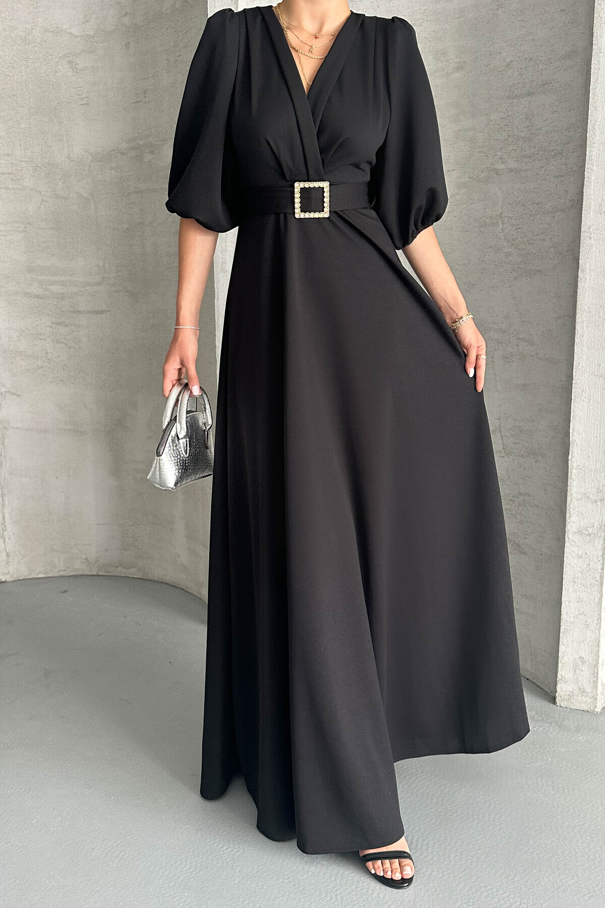 Kadın Siyah Krep Kumaş Taşlı Kemer Detaylı V Yaka Balon Kollu Maxi Elbise 77124 Kadın Siyah Krep Kumaş Taşlı Kemer Detaylı V Yaka Balon Kollu Maxi Elbise 77124 77124-WETEX 42