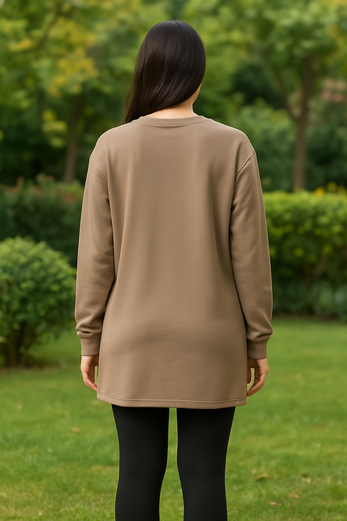 Kadın Koyu Bej Yırtmaçlı Çiçek Aksesuarlı Tunik Kadın Koyu Bej Yırtmaçlı Çiçek Aksesuarlı Tunik BTÇÇK 2XL