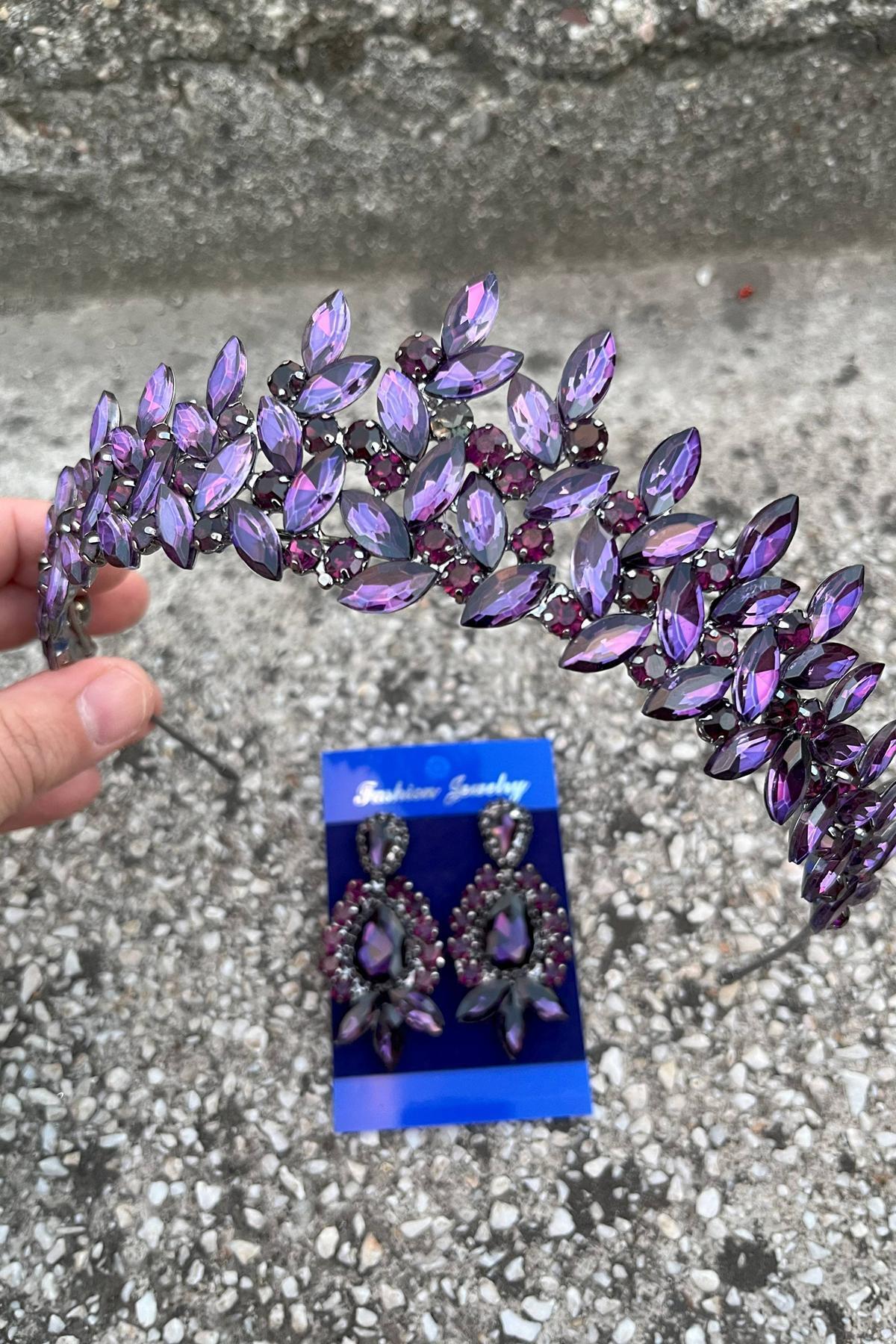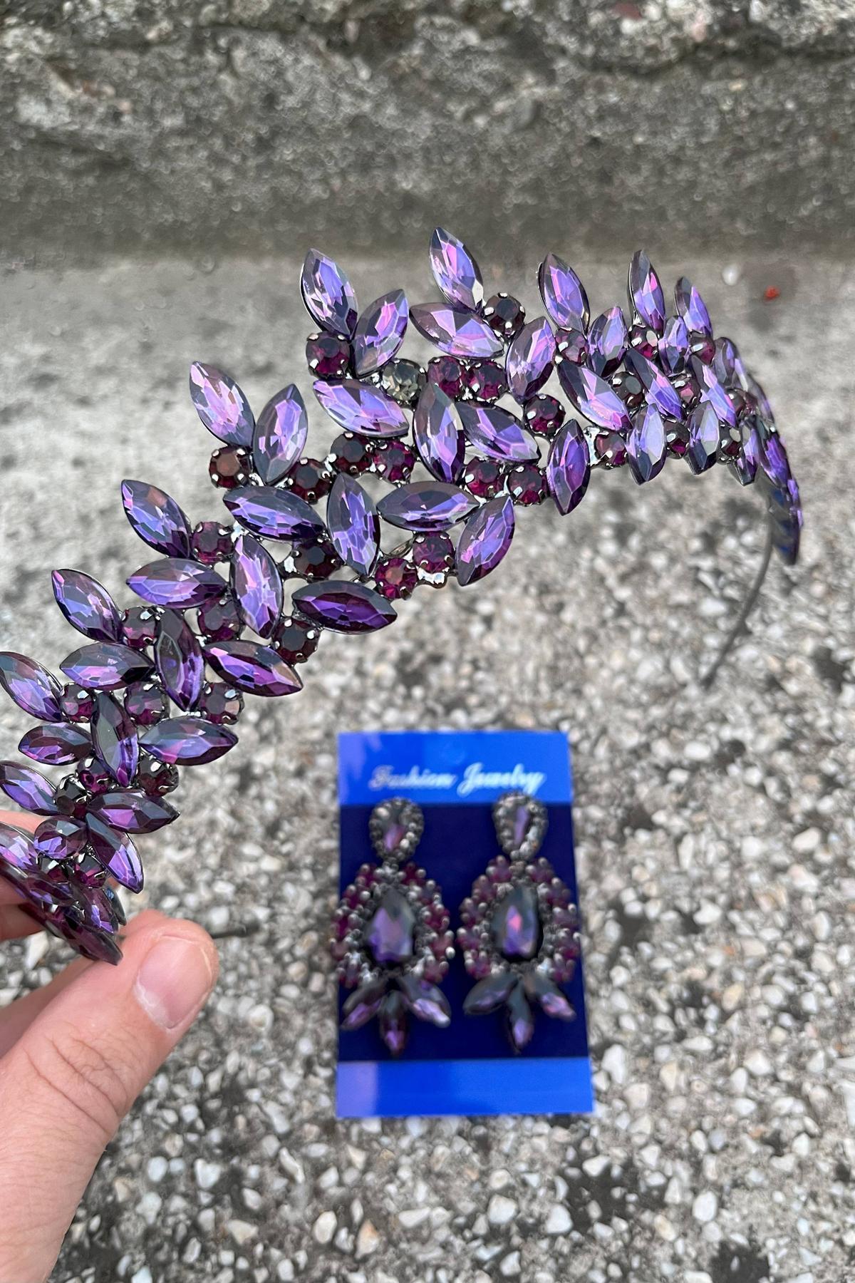 Regina Mor Gelin Kına Tacı Özel Gün Aksesuar Kadın Taç Ve Üç Mekik Küpe Takımı – Taç, Kristal Taşlı