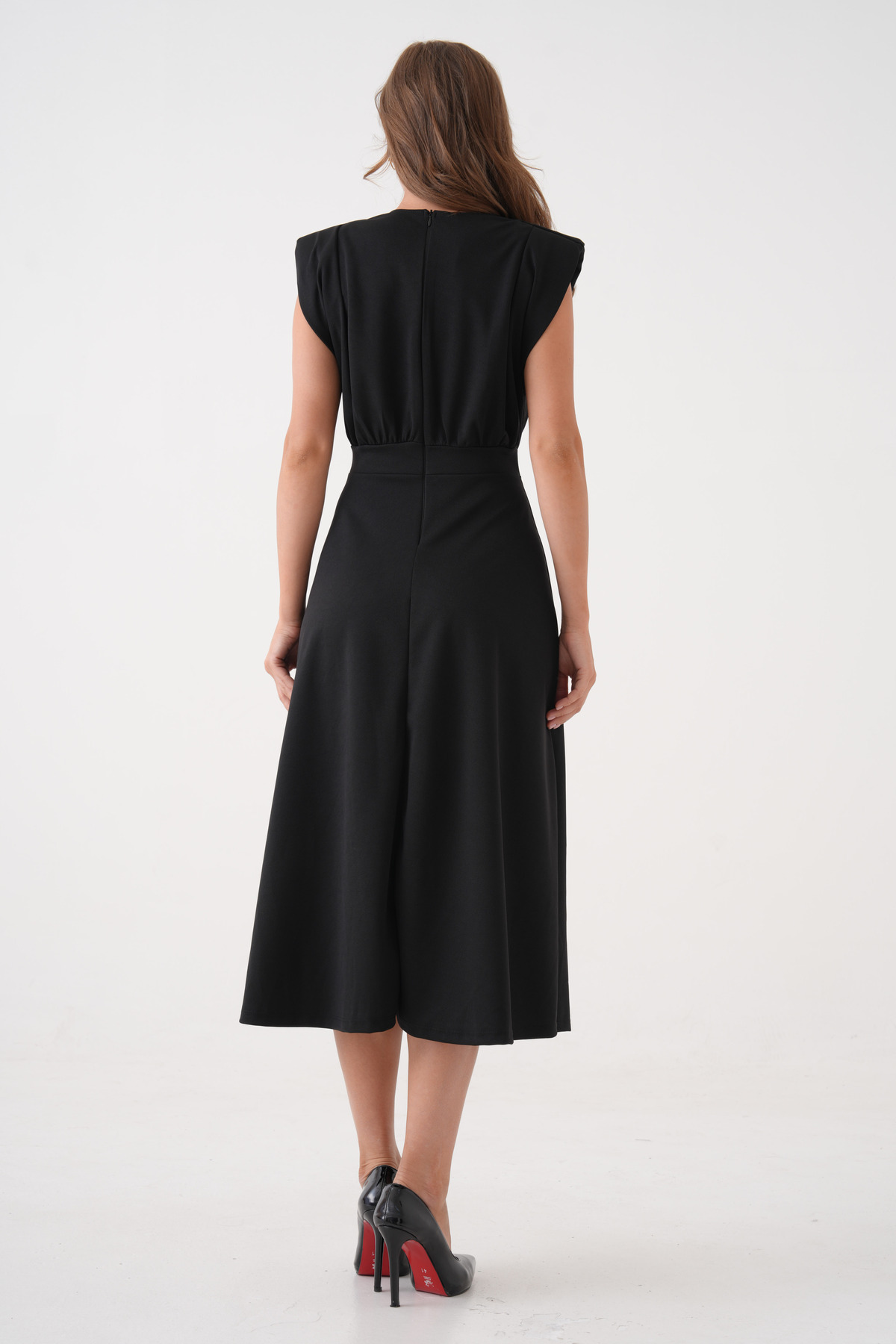 Esnek Krep Kumaş Degaje Yaka Omuzu Vatkalı Gold Aksesuarlı Kloş Kesim Midi Boy Siyah Elbise 77129 Esnek Krep Kumaş Degaje Yaka Omuzu Vatkalı Gold Aksesuarlı Kloş Kesim Midi Boy Siyah Elbise 77129 4S1B-WETEX-77129 44