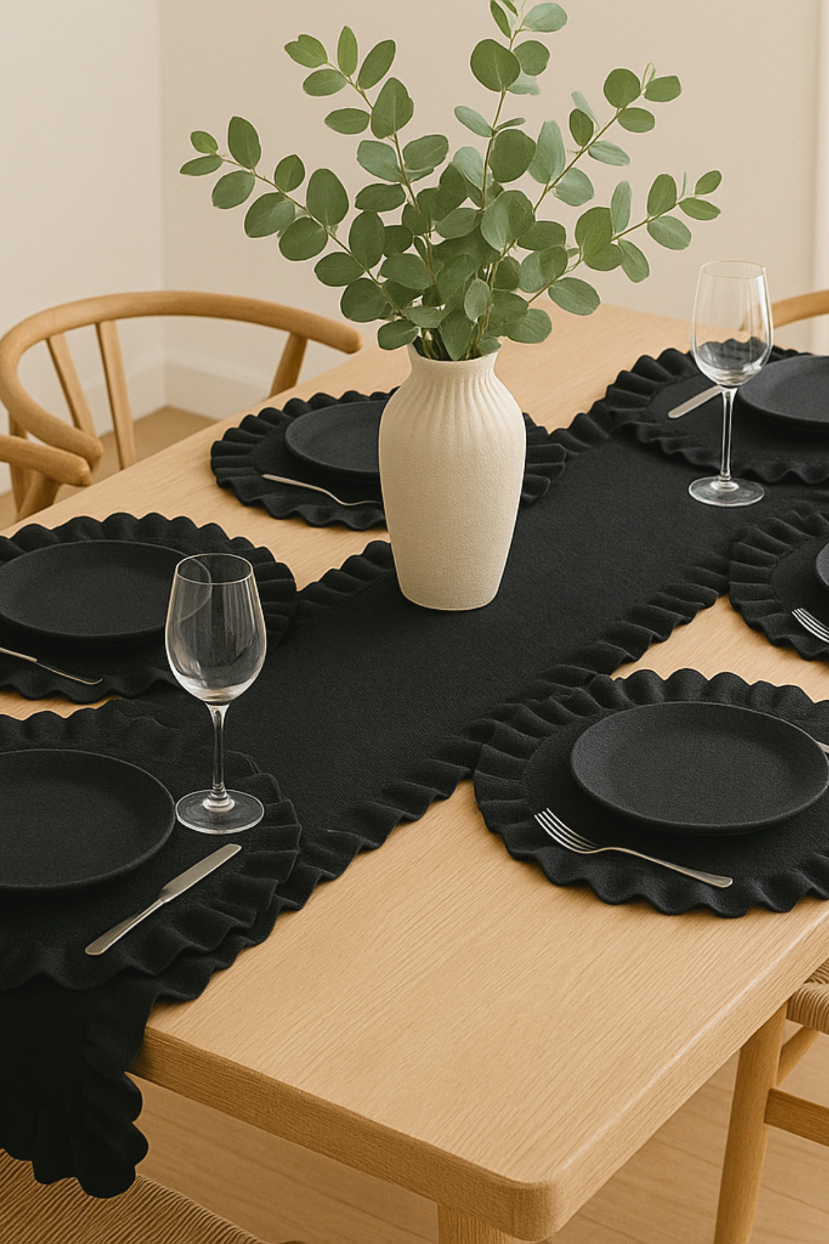 Siyah Fırfırlı Keten Runner & 6'lı Fıfırlı Supla Seti - 7 Parça Çeyiz Seti Siyah Fırfırlı Keten Runner & 6'lı Fıfırlı Supla Seti - 7 Parça Çeyiz Seti kmzçeyizseti تک سایز