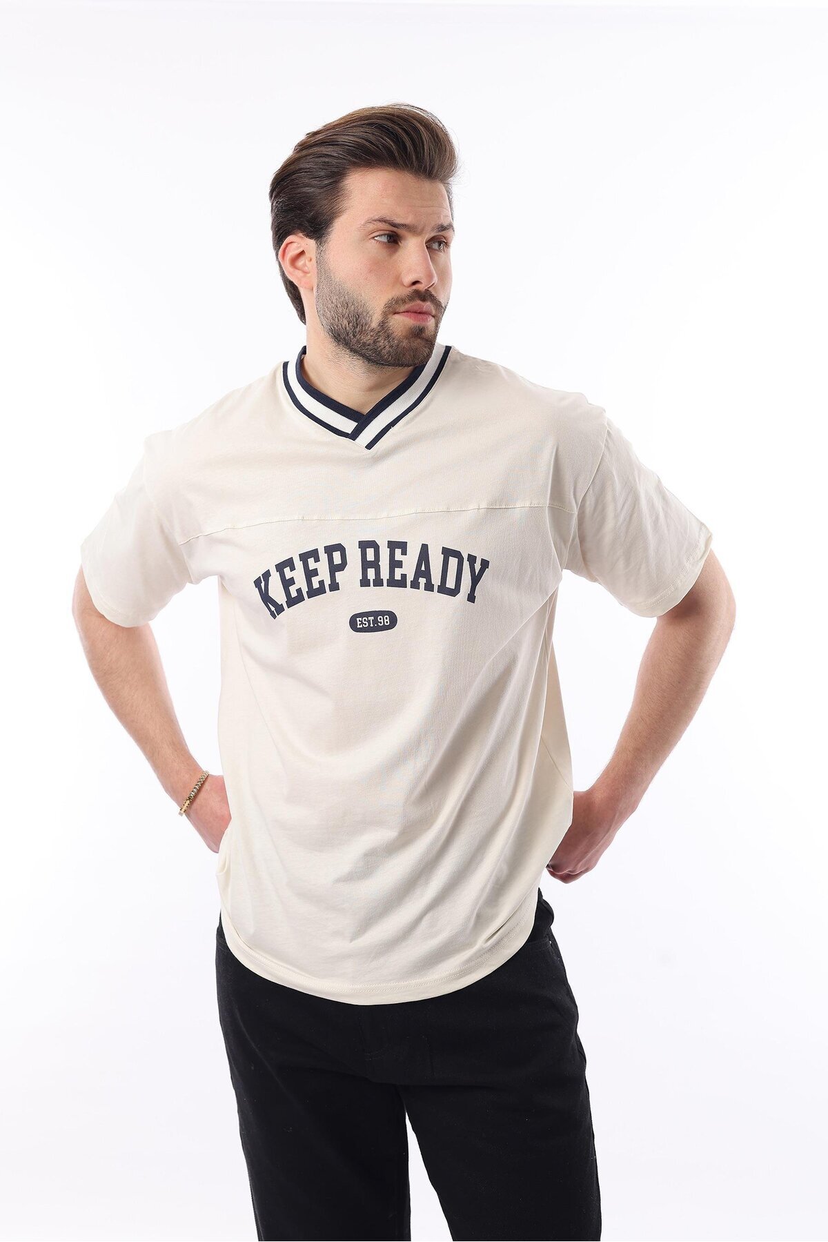Ekru V Yaka Baskılı Kısa Kollu Overfit Tişört 7039 Ekru V Yaka Baskılı Kısa Kollu Overfit Tişört 7039 2XL