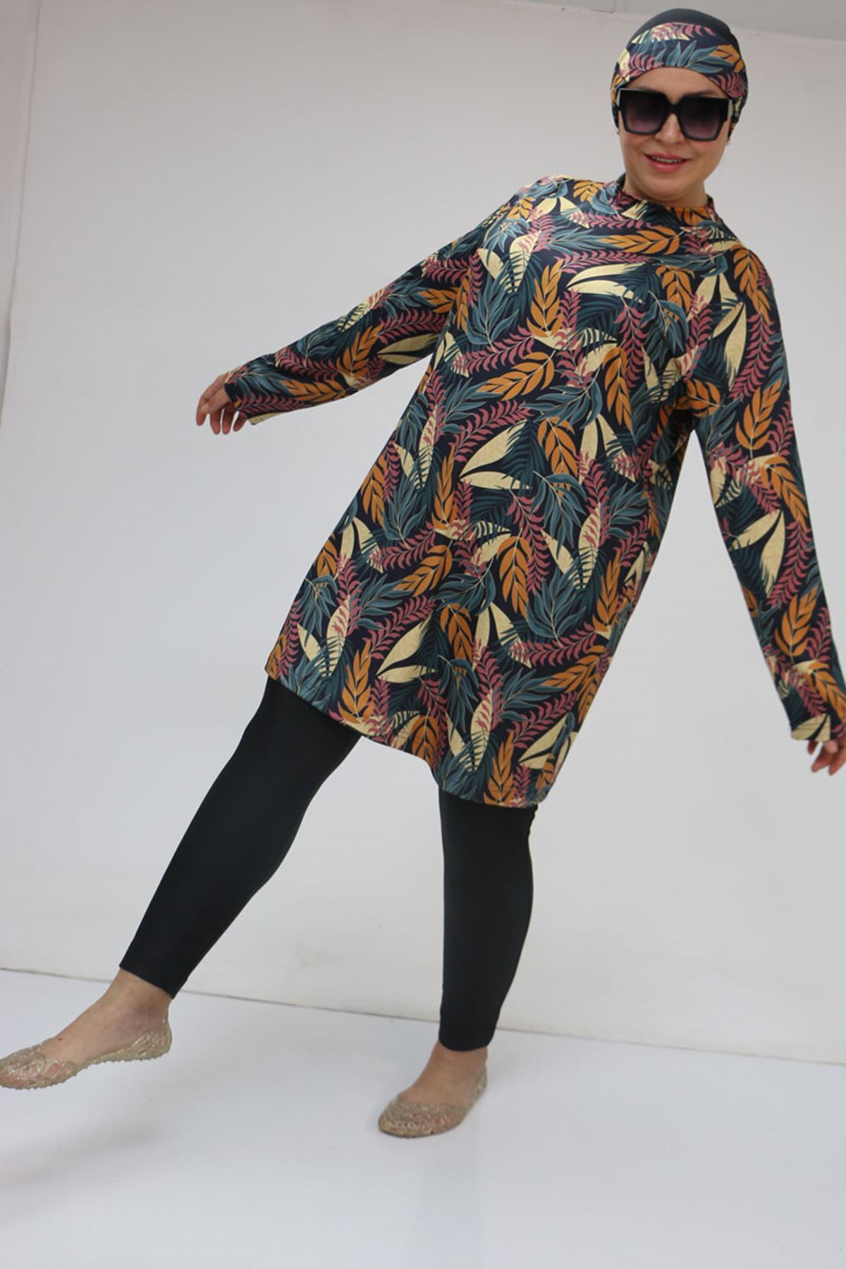 1727 Büyük Beden Uzunkol Tesettür Mayo Takım - Yaprak Desen Hardal 1727 Büyük Beden Uzunkol Tesettür Mayo Takım - Yaprak Desen Hardal 9XL