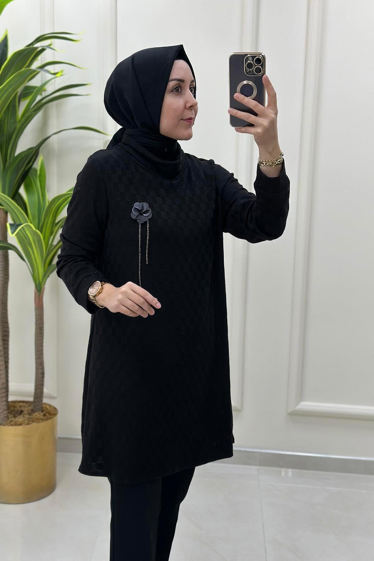 Dama Desen Degaje Yaka Broşlu Triko Kadın Tunik Siyah QTN 2866 Dama Desen Degaje Yaka Broşlu Triko Kadın Tunik Siyah QTN 2866 QTN-25K2866 42