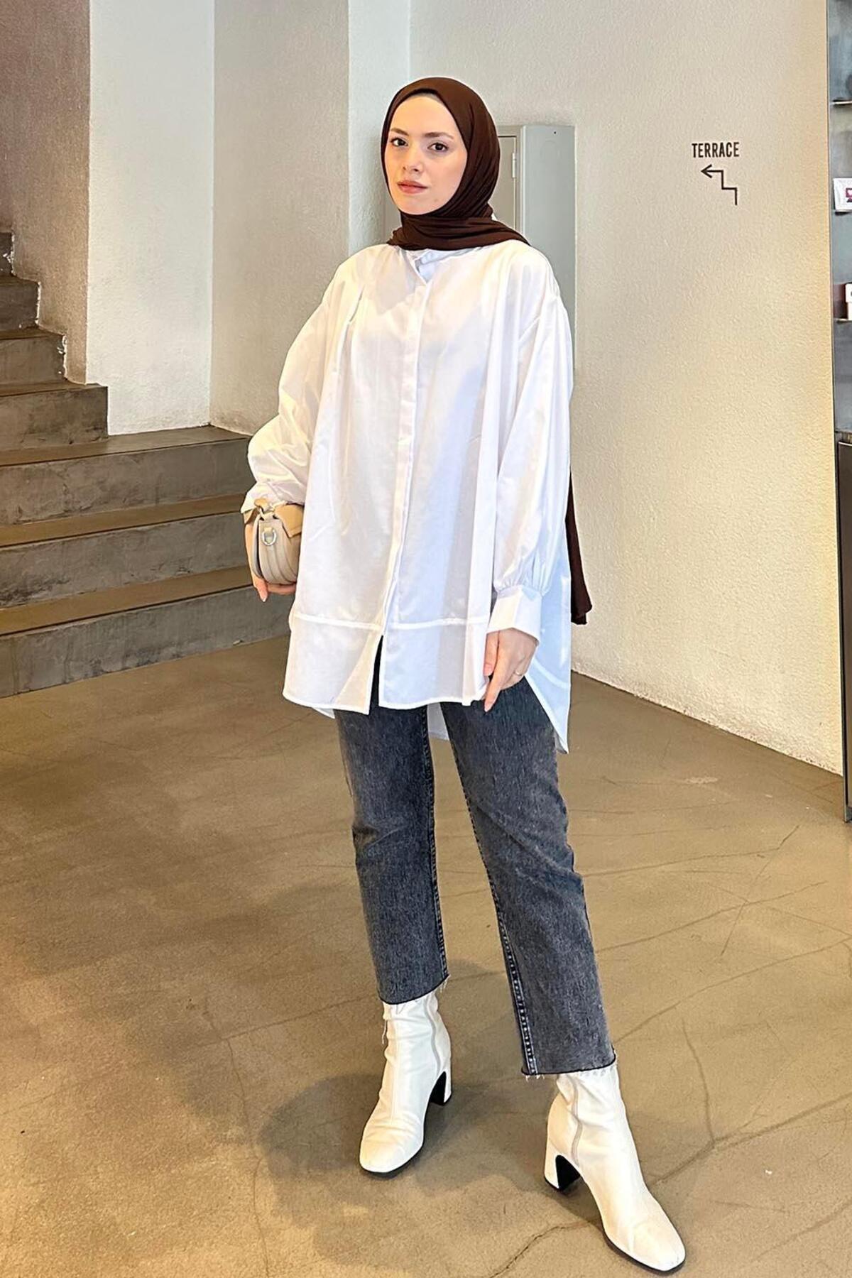 Bel Bağlamalı Omuz Vatkalı Gömlek Beyaz Bel Bağlamalı Omuz Vatkalı Gömlek Beyaz NWS0061-1 XL