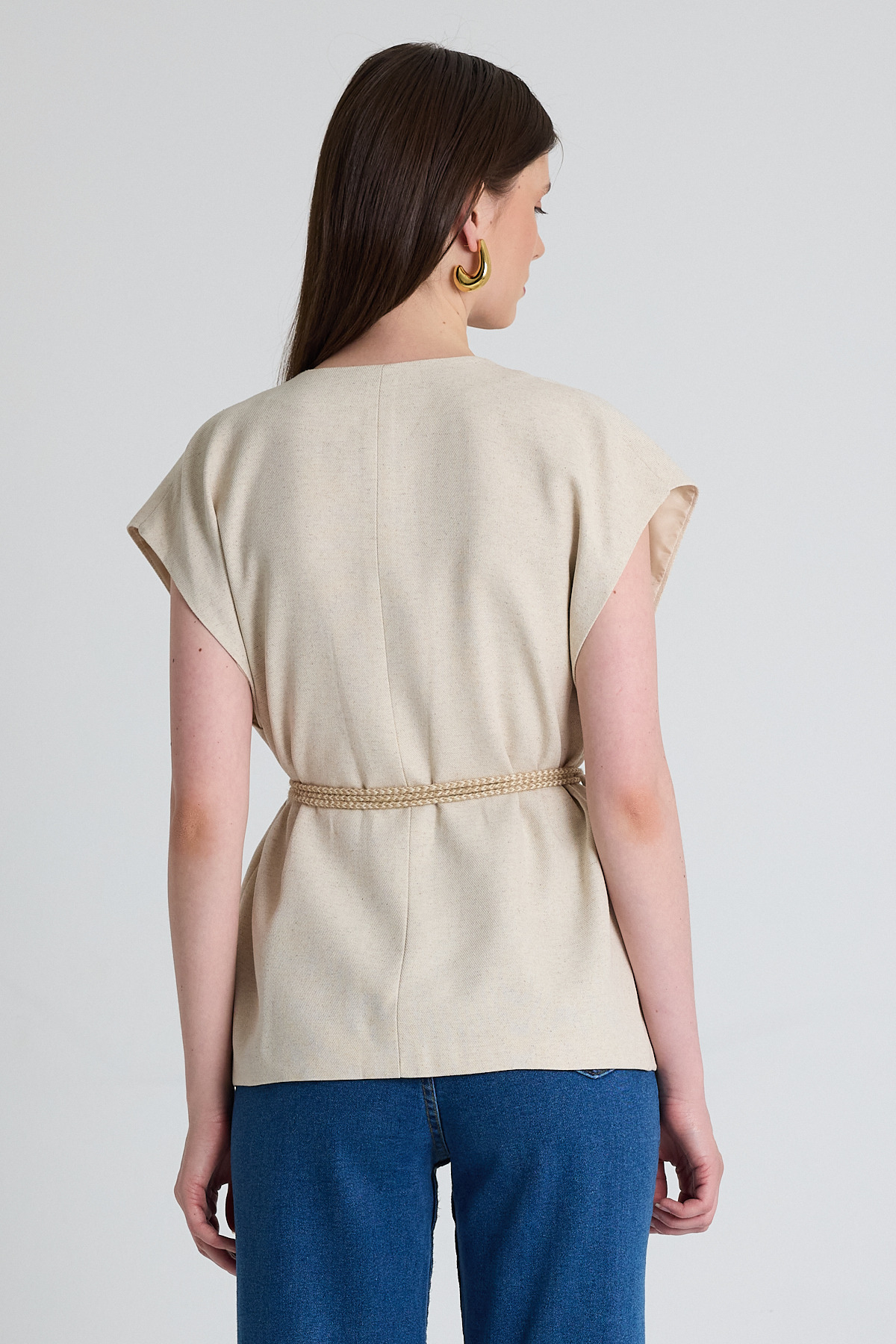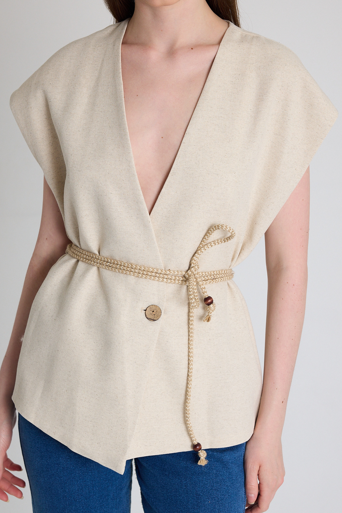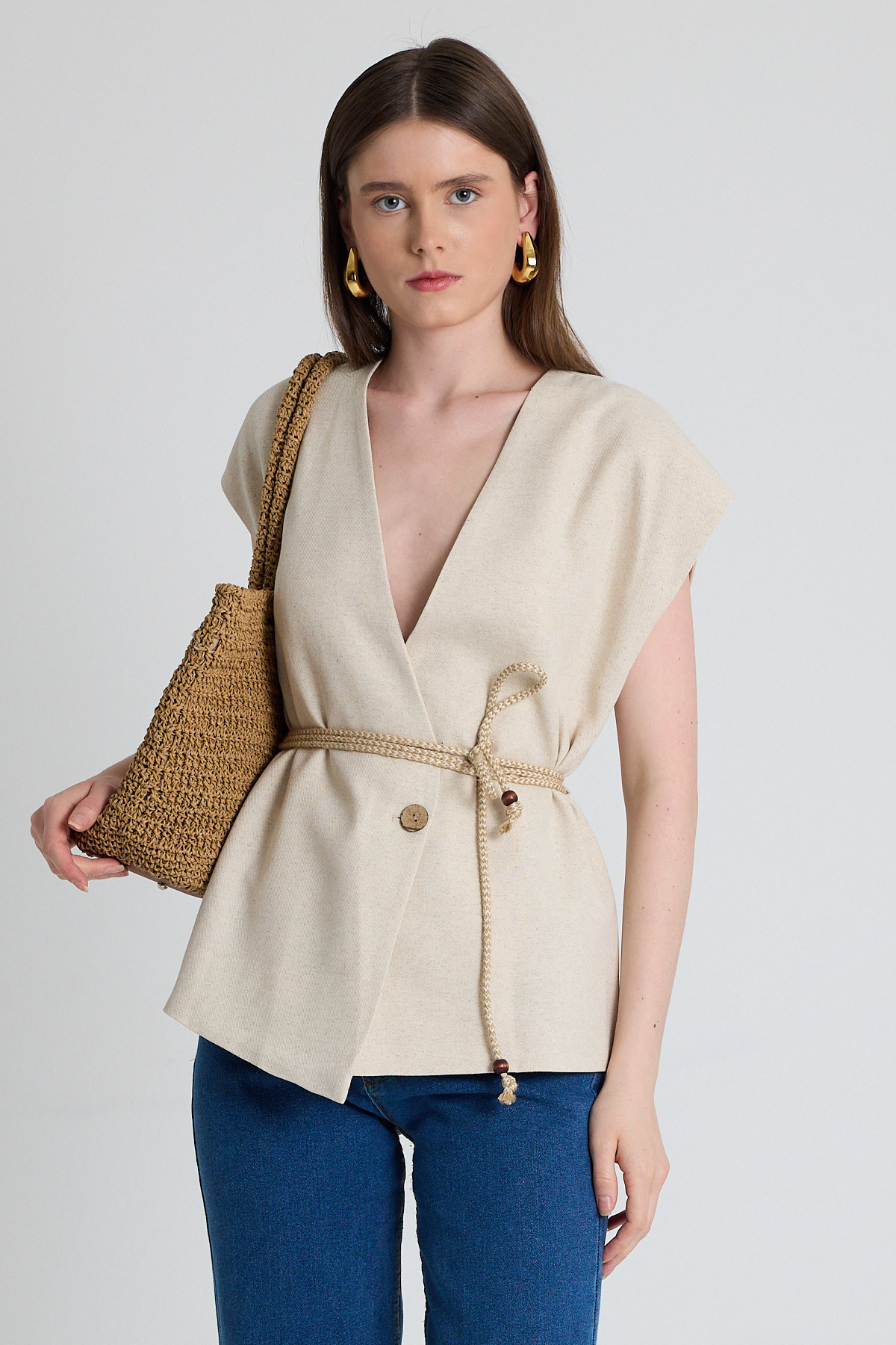 Natural Hasır Kemerli V Yaka Kısa Kollu Ceket Yelek 2378 Natural Hasır Kemerli V Yaka Kısa Kollu Ceket Yelek 2378 25Y1123UST191 XL