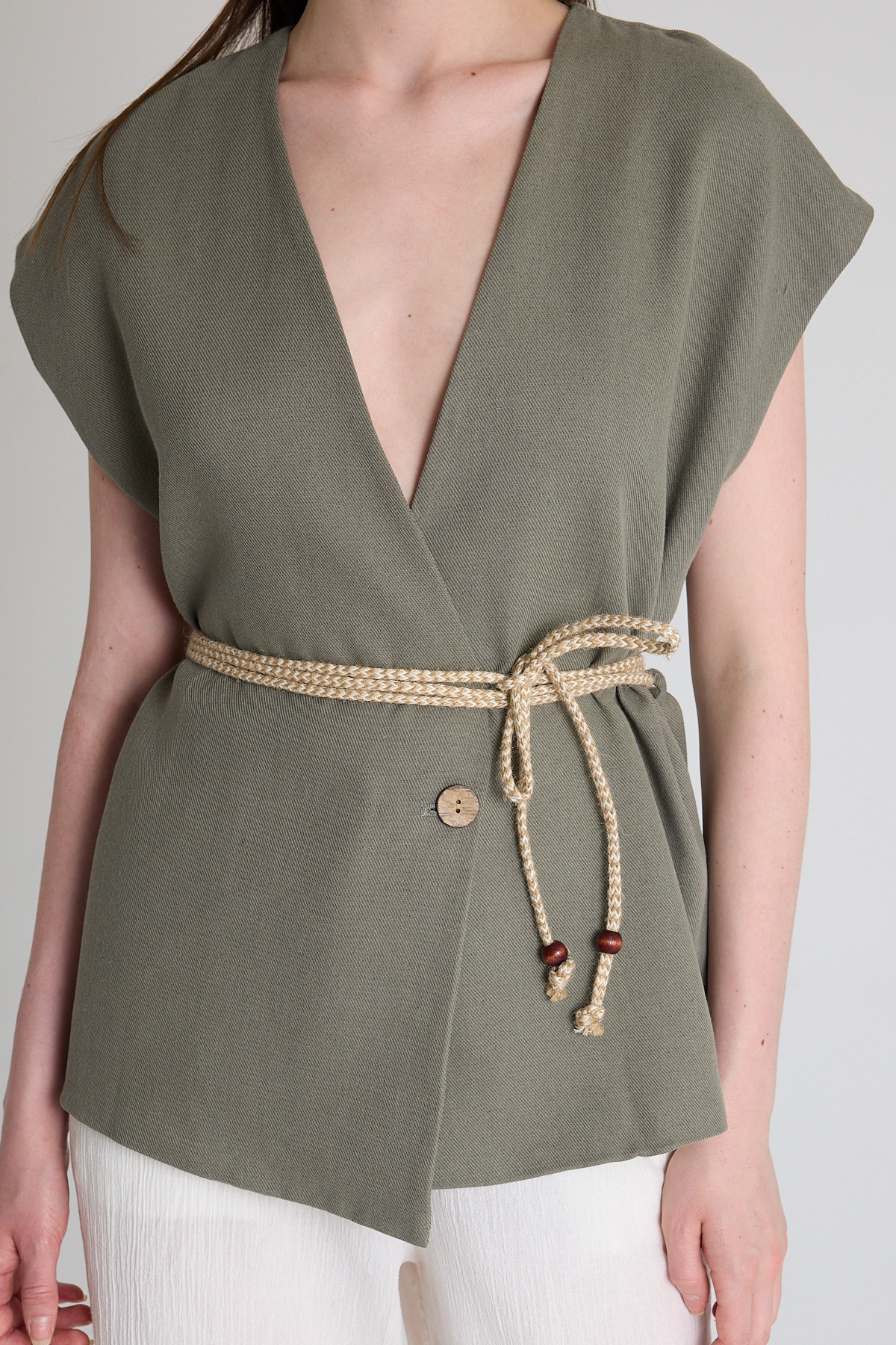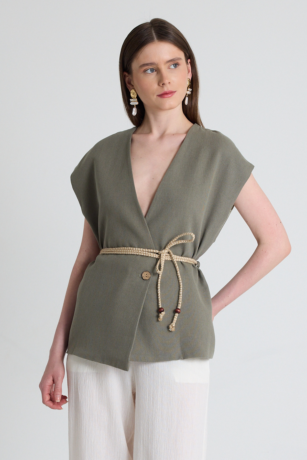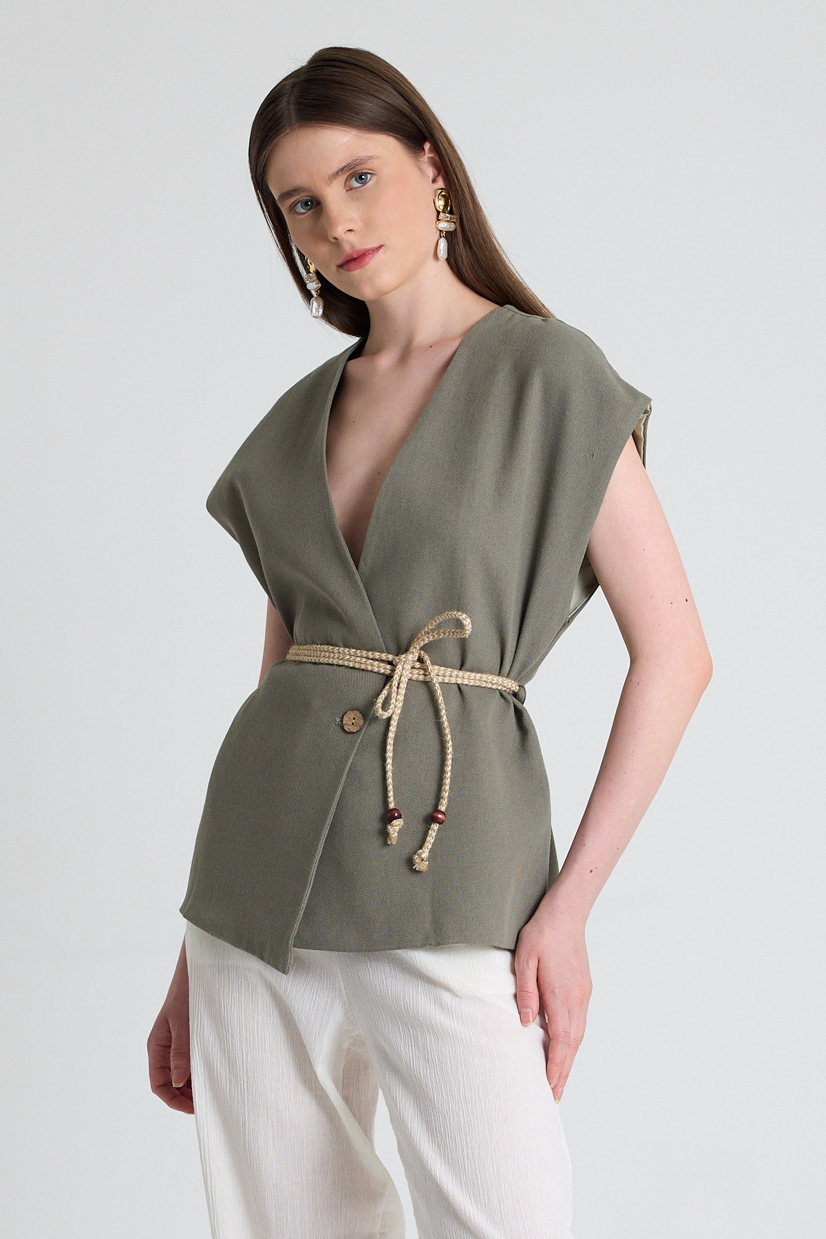 Olive Yeşili Hasır Kemerli V Yaka Kısa Kollu Ceket Yelek 2378 Olive Yeşili Hasır Kemerli V Yaka Kısa Kollu Ceket Yelek 2378 25Y1123UST191 XL